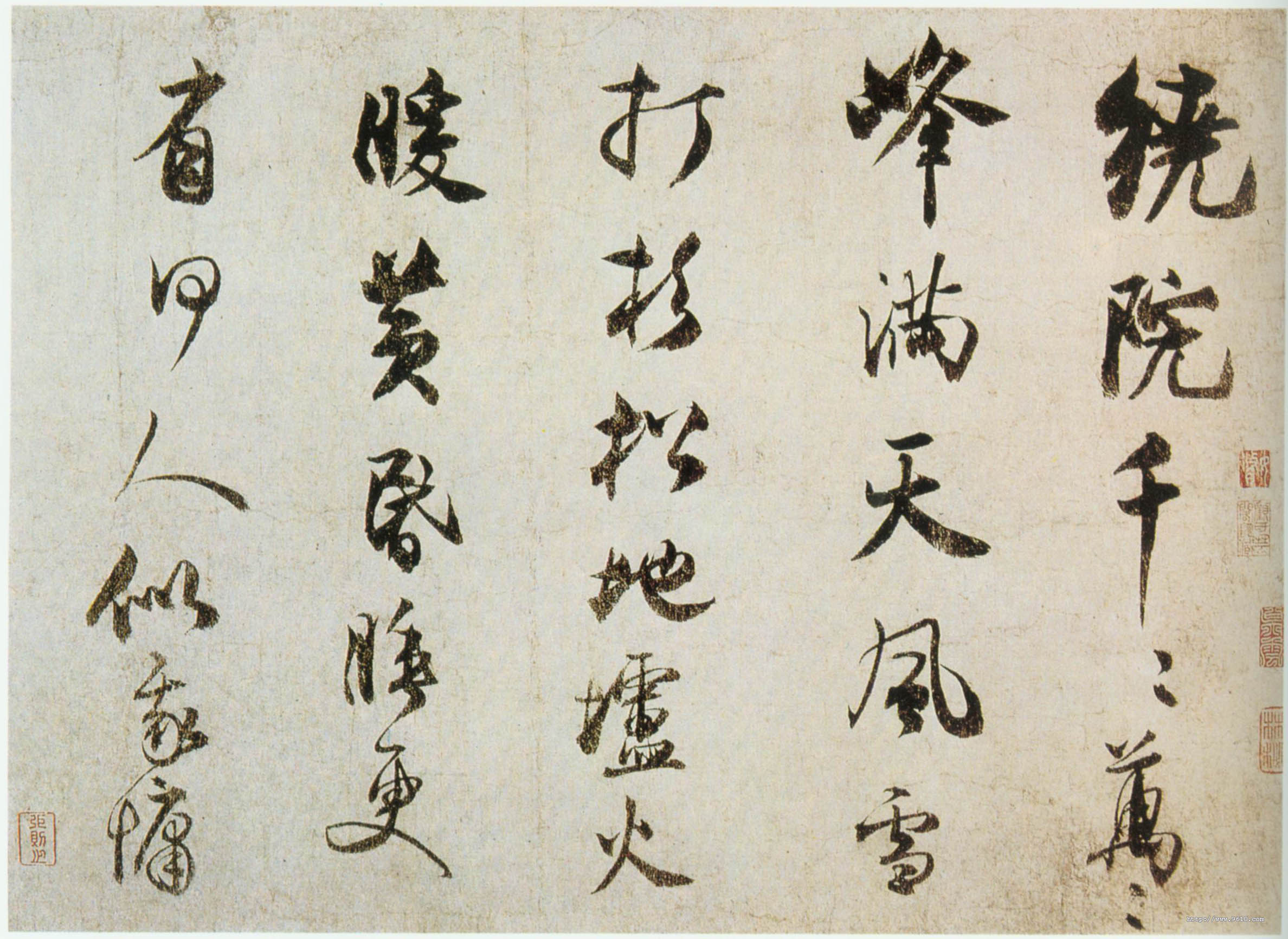 释 文 :黄华山真隐,一行涉世,便觉俗状可憎,时拈秃笔作幽竹枯槎,以自料理耳。 王庭筠 《李山画风雪杉松图卷跋》纸本 (画)29.7x79.2cm(全幅)31.2x1003.4cm 美国藏 释 文 :绕院千千万万峰,满天风雪打杉松。地炉火暖黄昏睡,更有何人似我慵。 书法宗米芾,行笔疾速,富于变化。但不尽是米芾的风格,有他其自身的特点,书写作风十分严谨。用笔中锋、侧锋并使,点线丰腴厚实,绝少枯笔飞白;笔致俊逸,神气超迈。章法方面,这幅字首尾布白相应,行距匀称妥贴,对行与行的处理,注意揖让呼应,达到相安相得。 王庭筠 跋米芾《研山铭》 | |