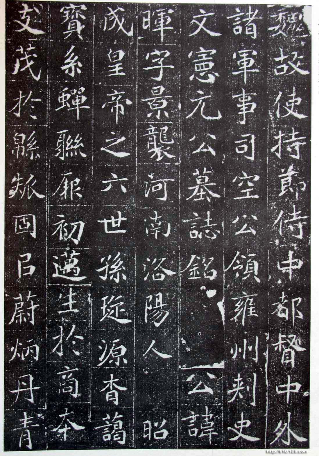 北魏《元晖墓志》,石为正方形,每边长75厘米,厚15厘米,刊于北魏神龟二年(519),原石现藏西安碑林。 此墓志于1924年由于右任先生从洛阳购得,1935年冬天由杨虎城将军为于右任运至西安。元晖字景袭,魏昭成帝六世孙,《魏书》有传。 此志为北魏墓志中的精品,书写极为娴熟自如,清雅超脱,因此志书刻是北魏晚期,已基本摆脱了剑拔弩张的弊病,充满了平和之气。 墓志最后7行上部分书法明显粗壮与前段书写极不协调,然字体结构、用笔同出一辙,由此可见书丹为同一人,而由两位刻工分别刻成,形成了这种奇特的现象。
