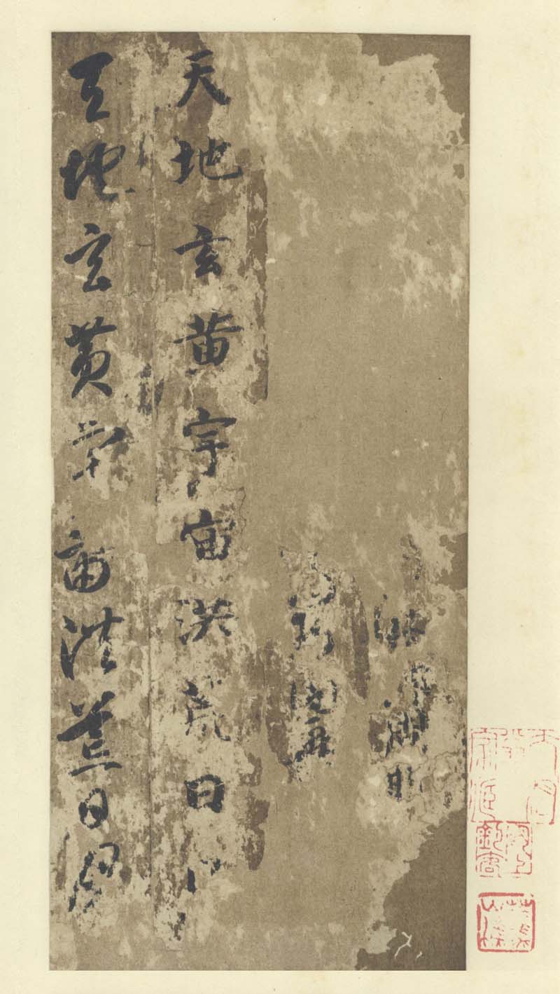 常居永兴寺阁,临池学书。闭门习书三十年。初从萧子云学书法,后以先祖王羲之为宗,在永欣寺阁上潜心研习了30年,所退废笔头满五大竹簏,埋之成冢,谓之“退笔冢”。 智永成为声名卓著的书法家。至使求墨宝者络绎不绝,踏破门槛,不得不用铁皮裹上,后来,这故事变成了一个典故,叫“铁门限”。 苏轼评其书“骨气深稳、体兼众妙,精能之至”,宋米芾《海岳名言》评曰:“智永临集千文,秀润圆劲,八面具备”。明董其昌《画禅室随笔》说他学钟繇《宣示表》,“每用笔必曲折其笔,宛转回向,沉著收束,所谓当其下笔欲透纸背者”。他所写的《千字文》清何绍基说:“笔笔从空中来,从空中住,虽屋漏痕,犹不足以喻之”。我们细读他的墨迹《千字文》,看得出他用笔上藏头护尾,一波三折,含蓄而有韵律的意趣。董、何之说可谓精确、具体、恰当。 【作品欣赏】↑top 《真草千字文》真草二体,是智永传世代表作,也是我国书法史上的留传千古名迹。据载智永曾书《千宇文》八百本,散布江东诸寺,现传世的有墨迹、刻本两大类。 (1)纸本墨迹卷。册装。卷首已残,仅存正文二百行,不避隋唐帝讳,又有数字与唐以来传本不同,如“召”,后世本作“吕”等。据考此卷于唐代时即已传入日本。原为谷铁臣旧藏,故一称“铁臣本”。后归小川为次郎。后有杨守敬、内藤虎等跋,多认为墨迹本为智永真迹,但清代杨守敬等疑为唐人临本。 (2)另有敦煌所出贞观十五年(641)蒋善进临本,已残,存三十四行。 石刻本。宋代薛嗣昌(薛绍彭弟)据长安崔氏藏真迹于大观己丑(1109)刻石,今在陕西西安碑林。《金石萃编》载:帖共八石,石高八寸,宽二尺四寸,满行十二字。其中避唐讳如“民”、“基”等字皆有缺笔,赵德甫断为天宝以后人为之,见《语石》。此世称“关中本”、“陕西本”。但原石已佚,现存碑林者为翻刻。故宫博物院有宋拓本,有题签三:朱翼盒书二、王铎书一。另松江(今上海松江区)学宫等处亦有翻刻本,而镇江“宝墨轩本”则系由传至清初之真迹上石,刻手为刘光畅,刻艺极精,书法极美,字体温雅,但比“关中本”乏古意。此外还有“龙师起本”,缺首行十字,始于“龙师”云云,真迹传入清顾文彬家,刻入《过云楼藏帖》,此本较上述各本更下,或疑为后人临摹者。 此帖代表了隋代南书的温雅之风, 继承并总结了“二王”正草两体的结体、草法,从体法上确立了它的范本作用。