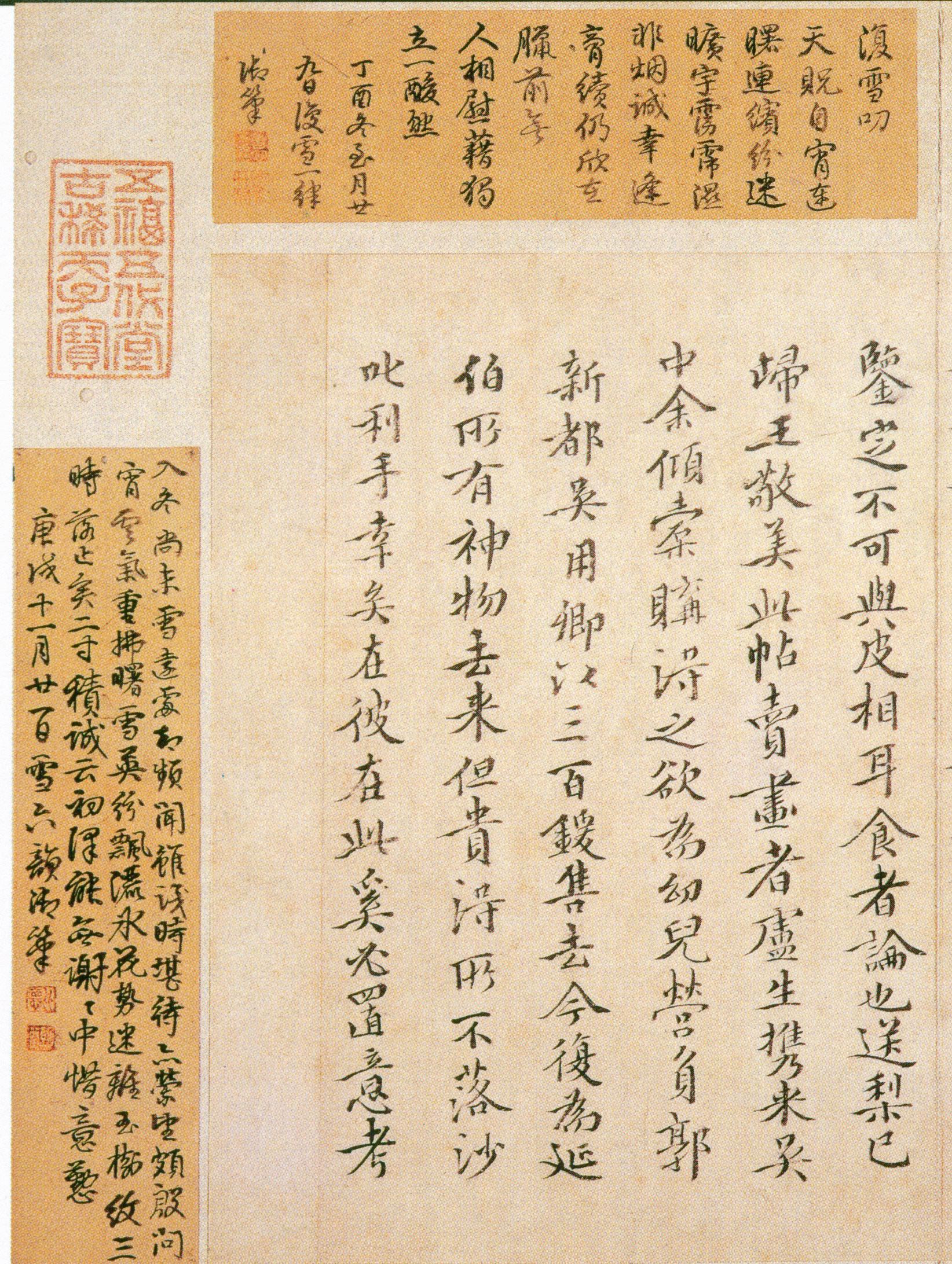 此帖其中或行或楷,或流而止,或止而流,形成特有的节奏韵律。笔法圆劲古雅,无一笔掉以轻心,无一字不表现出意致的悠闲逸豫。在赵孟頫、刘赓、护都沓儿、刘承禧、王稚登、文震亨、吴廷、梁诗正等人的跋语中都表示惊羡和赞叹。清乾隆皇帝曾说:“天下无双,古今鲜对”;“龙跳天门,虎卧凤阁”。他把此帖和王珣《伯远帖》、王献之《中秋帖》,一同收藏于养心殿西暖阁,并名其堂为“三希堂”,视为稀世瑰宝。