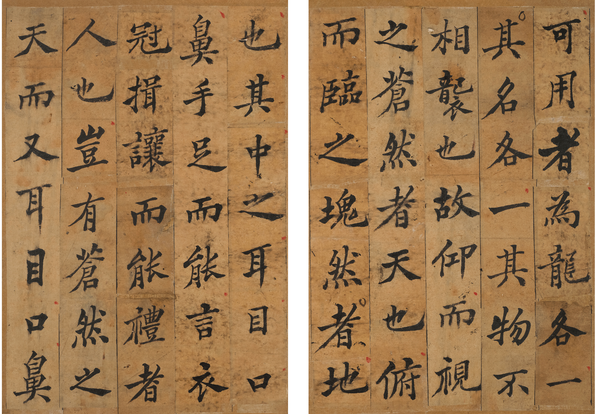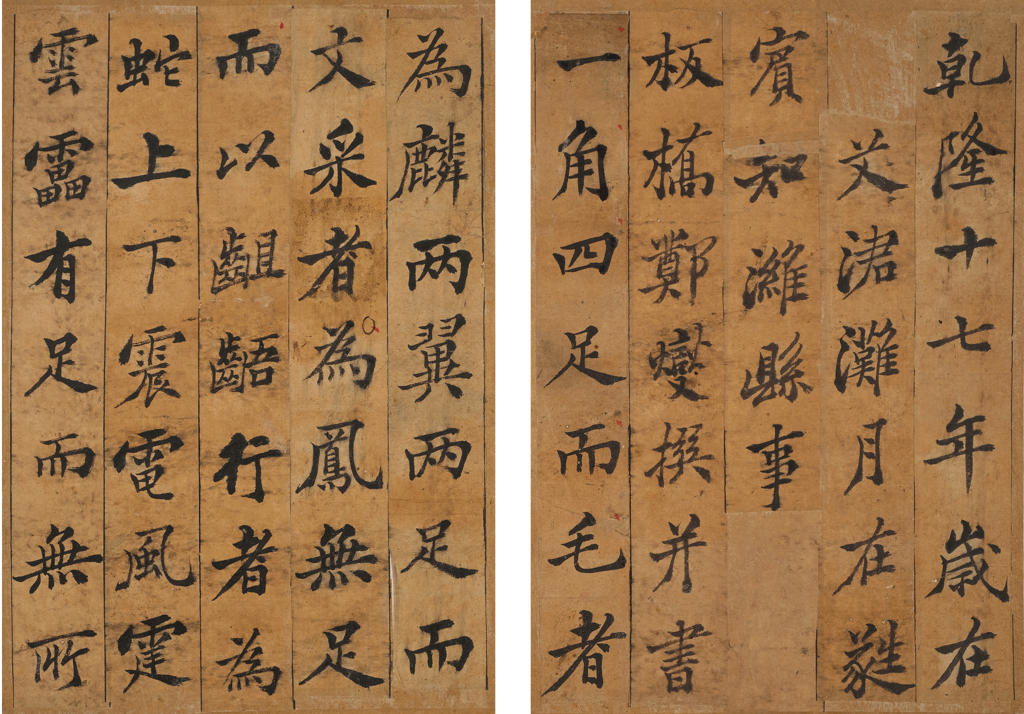 更为难得的是,“三绝碑”所依据的板桥书法墨迹仍在世间。此郑板桥书《新修城隍庙碑记》册页为剪裱本,是为刻石专门所书的原稿,字口多有勾涂痕迹,当是工匠当年以书法上石时所为。古人刻碑有两种方式,一种是直接书写在石碑表面,谓之“书丹”,书毕由工匠就笔迹凿刻。这种方式不会有墨迹存留,虽然可以最大程度保持书写原貌,但是弊端也显而易见:一是书家换了书写材质之后,未必能发挥其正常水平;二是石碑转移困难,书写搬运都有诸多不便。第二种刻碑方式则是书家将碑刻内容书于纸上,然后由工匠将内容通过勾摹上石。这种方式对于工匠的摹刻能力有很高的要求,原作的手稿也会受到一定程度的损坏,但是毕竟要便捷一些,所以古人刻碑多用此法。郑板桥这件《新修城隍庙碑记》,便是以这种方式刻石,其墨迹本因此得以被有心之人保存了下来,并且重新装裱成册页的形式。