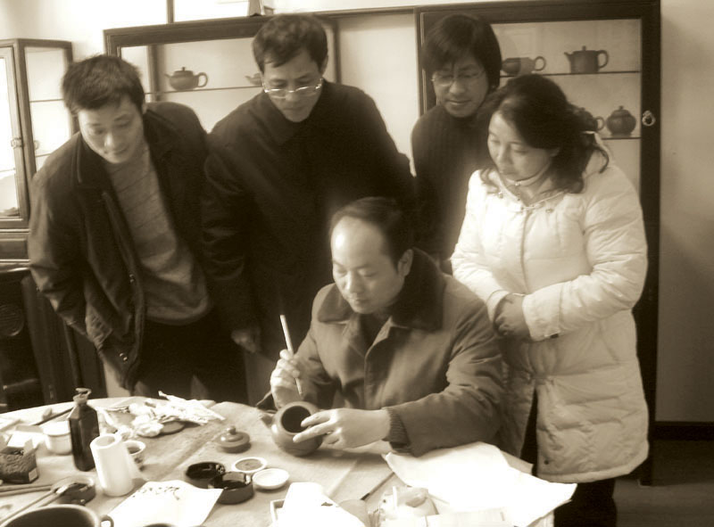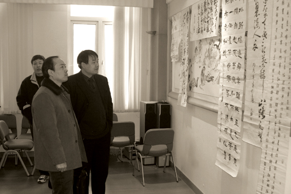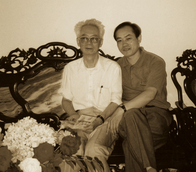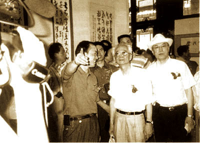 应特别邀请,中国文联副主席、中国书法家协会主席沈鹏先生(前排中)与前中央美院副院长、《美术》杂志社社长叶毓中教授(前排右)出席了2000年6月在南京江浦县“林散之纪念馆”举办的“当代百家书林散之诗作展”开幕式。图为何道宽(前排左)陪同二位前辈参观展览作品。
