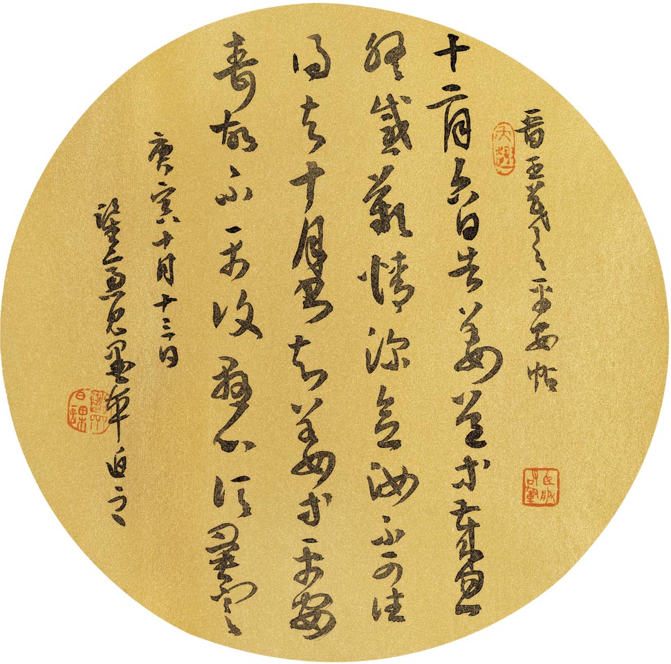 临王羲之平安帖团扇? 作品尺寸:34cm×34cm 创作时间:2010年秋 作品释文:晋王羲之平安帖。十二月六日告姜道等,岁忽终,感叹情深,念汝等不可往。得去十月书,知姜等平安,寿故不平复,悬心。倾异寒。庚寅十月十三日,鉴斋见墨本,追之。 钤 印:臣服右军、天趣、鉴斋日课。