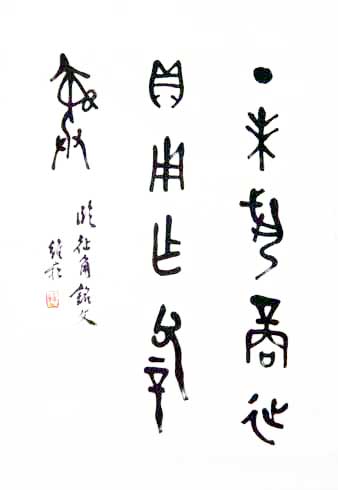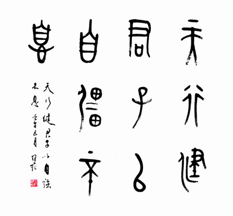 其次,先生的作品调整了字的结体和章法。先生的临摹功夫罕有其匹,下笔如有神,形态毕肖,但如果遇到原拓本中字的线条或部件有明显夺衍、变形、借位等情况,先生都要参考不同器铭中相同的字加以修正,使之更符合历史和艺术的真实,更臻完美。而用金文组词成句的作品,先生则注意根据总体的需要,在结体上增加一些参差错落、俯仰欹侧等细微变化,以奇正变化之势丰富字形,增加动感。在大章法上,则改变以前限于一器之内的有限天地进行布自的方法,而是适应宣纸书写和室内悬挂等需要,灵活安排章法。