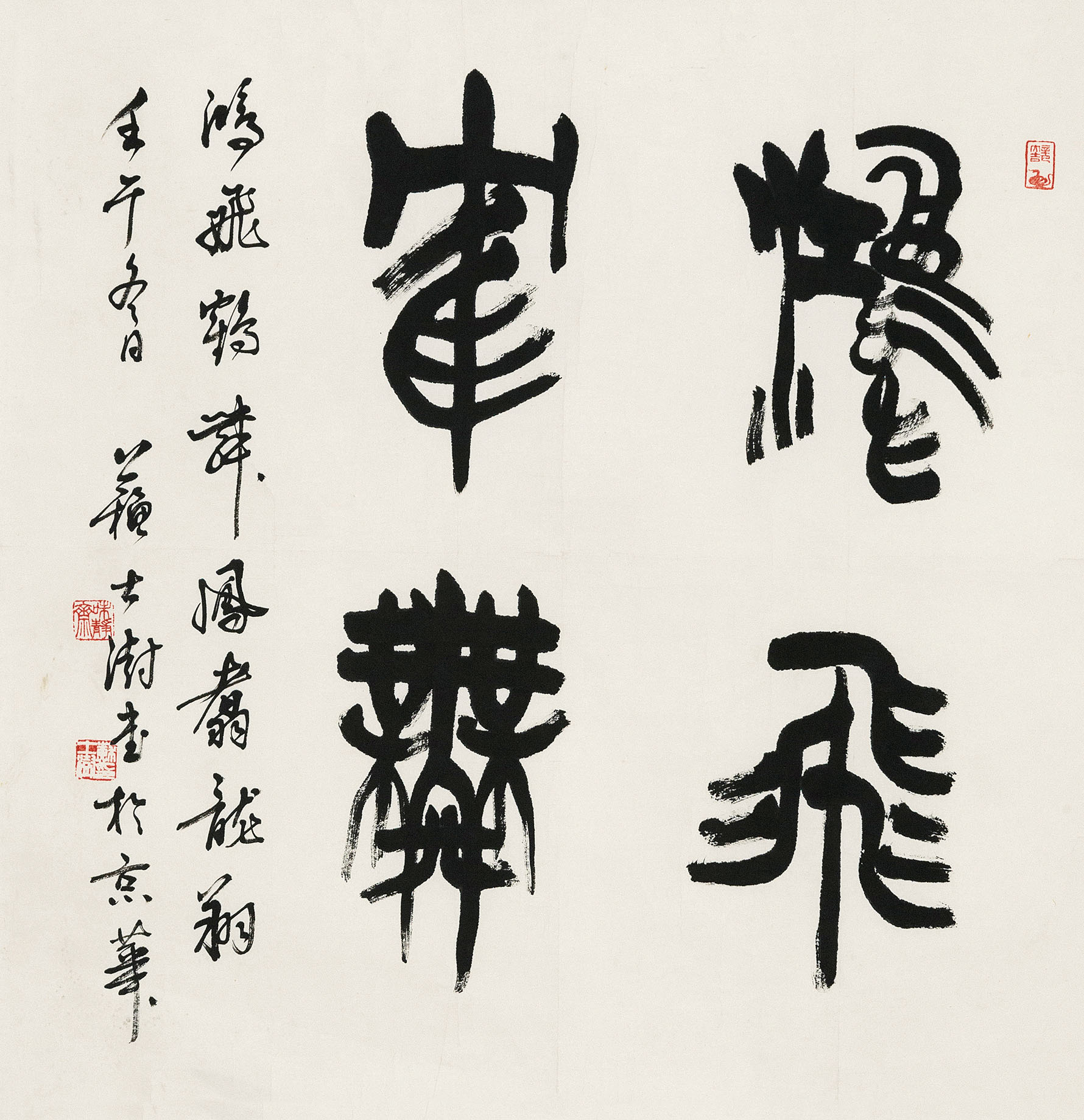 苏士澍《篆书斗方》 69×69cm 重庆尚文斋艺术品拍卖会 释文:鸿飞鹤舞。