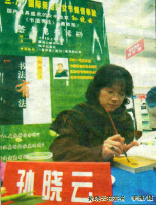 孙晓云是著名女书法家,她别出心裁地用毛笔为读者签名,这在搞过不知多少次类似活动的新华书店还是第一次,有的读者甚至一次买上五本十本,就是冲着这墨宝来的,不仅自己收藏阅读,还可以送给朋友做礼物。一位老年大学书画班的老