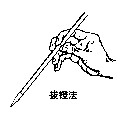 格,“取当住的意思”,“又有用揭字的,揭是不但当住而且还用力向外推”,指“无名指用甲肉之际紧贴着笔管,用力把中指钩向内的笔管挡住,