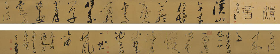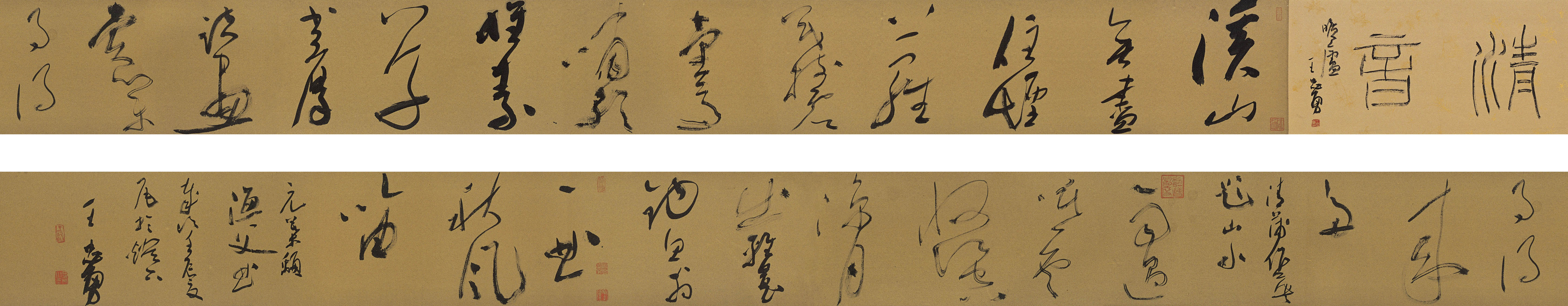 王忠勇 《清音》长卷 作品尺寸:35cm×900cm 作品释文:略 创作手记:此卷乃应近时“广东省著名书法家邀请展”而作。因内容为秋景山水题画诗,故挥运时笔意清峻优游,颇有云淡风轻之概。书成观之,其意境清旷高迈,用笔纷披洒脱,可谓近年来余大字手卷之合作也。 书写材料:狼毫、李廷珪油烟墨、色宣 印 章:王忠勇印、延年、玄微在心、魏晋风度、骋怀、长乐无极、换去毛骨、王记、忠勇之印