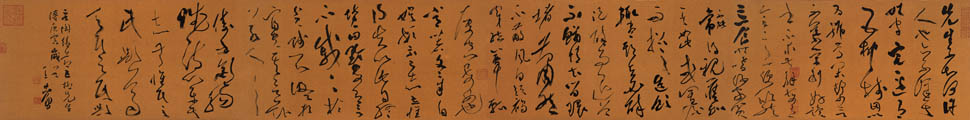 王忠勇《陶渊明五柳先生传》 作品尺寸:34cm×272cm 作品释文:略 创作手记:习草最贵“草情”,即下笔便有凤舞鸾翔之情性,洋洋洒洒,从容不迫,兴酣时又如骤雨狂风,更有一泻千里之概……余不才,虽不能至,心向往之。 书写材料:狼毫、李廷珪油烟墨、仿古宣 印 章:长乐无极、旅、大雅、魏晋风度、君子无逸、换去毛骨、无逸、王忠勇印