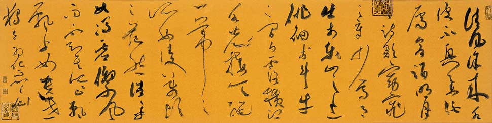 王忠勇 苏轼《前赤壁赋》一节 作品尺寸:34cm×138cm 作品释文:清风徐来,水波不兴。举酒属客,诵明月之诗,歌窈窕之章。少焉,月出于东山之上,徘徊于斗牛之间。白露横江,水光接天。纵一苇之所如,凌万顷之茫然。浩浩乎如冯虚御风,而不知其所止;飘飘乎如遗世独立,羽化而登仙。 创作手记:是作借东坡《赤壁赋》文意生发,笔下仿佛有“凌万顷之茫然”之意境。稍掺宿墨,更觉带燥方润之趣。 书写材料:狼毫、李廷珪油烟墨、仿古宣 印 章:骋怀、古印、王、忠勇印信、魏晋风度