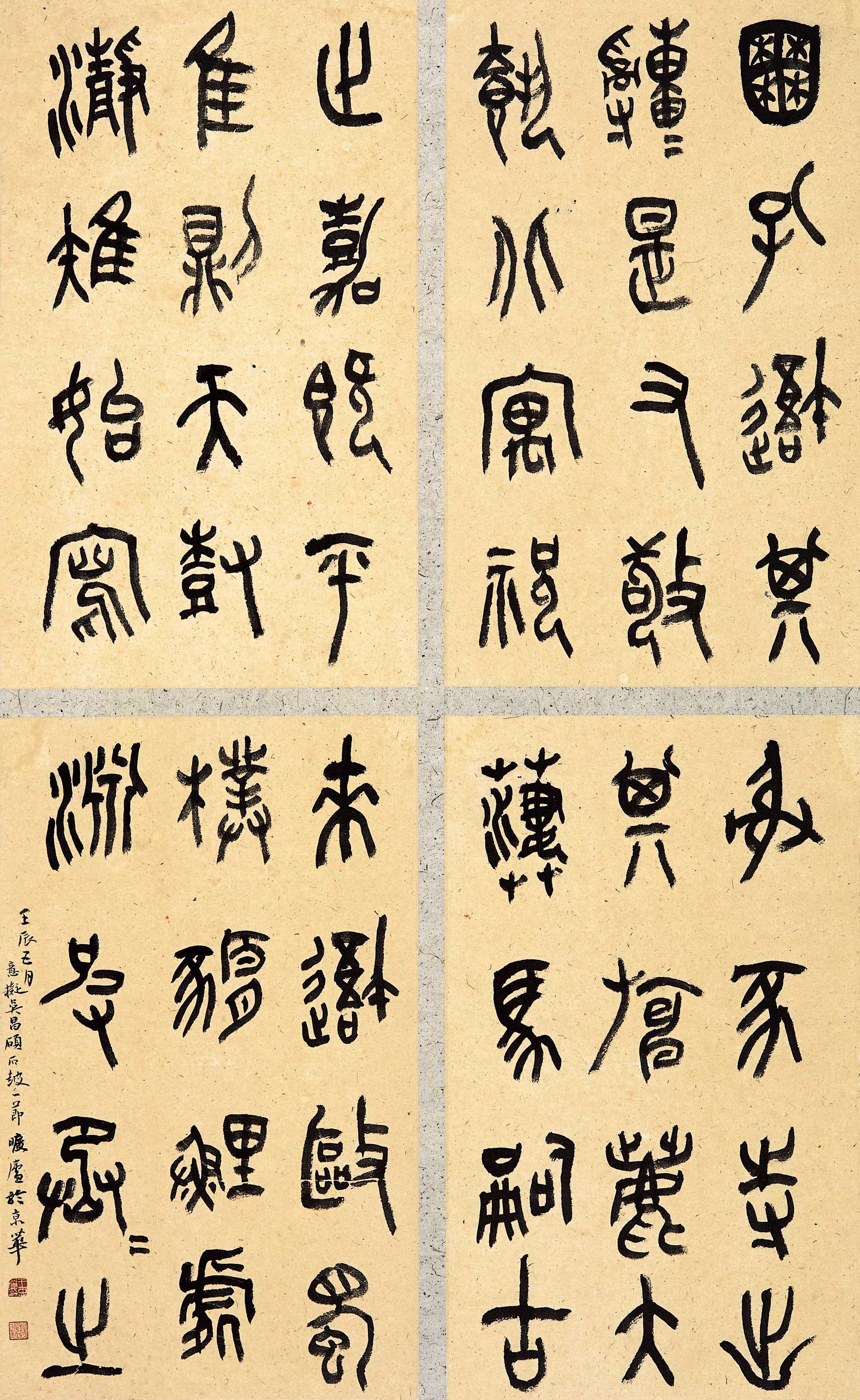 王忠勇 选临《石鼓文》 作品尺寸:50cm×80cm×4 作品释文:略 创作手记:偶临吴缶老石鼓于课上。强调笔触的敏感度,从而改变线条的原始质感,以帖化碑,略求松动苍古之意味。 书写材料:狼毫、李廷珪油烟墨、手工毛边纸 印 章:王忠勇印、无逸