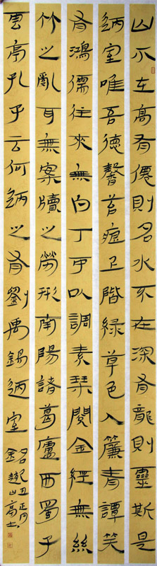 河南方城人,斋号楚风草堂,1963年7月出生。现为中国书法家协会会员,国家二级美术师。甘肃美协会员、甘肃省青年书协副主席,甘肃省书协理事兼创作委员会副主任。先后师胡公石、柴建方、李刚田、朱乃正、沈鹏等先生,现任兰州军区政治部文艺创作室专业创作员、国家二级美术师、中国书法家协会篆书专业委员会委员、东方印社副社长;曾任全国第九届书法篆刻大展、纪念老子诞辰2578周年全国书法大展、百年兰大杯全国书法大赛等大展大赛评委。他擅多种书体和篆刻,风格多样,作品曾参加中国美术馆首届当代名家书法提名展、中国美术馆篆刻艺术邀请展、当代篆刻艺术大展等国家级大展二十多次;获第七届全国书法篆刻大展“全国奖”、第四届全国楹联书法大展“全国奖”、第二届流行书风征评展“铜奖”、全国篆刻艺术展览“银奖”、全国隶书学术讨论会“三等奖等大奖多次。书法篆刻作品双双被中国美术馆收藏,书法作品被广东美术馆、江苏美术馆、中国国家博物馆等收藏或刻碑;出版有《中国美术馆当代名家系列作品集-书法卷-赵山亭》、《十方书道-赵山亭特刊》、《水浒一百零八将图赞》、《水浒英雄大观》等。这次展览同时得到了《中国书法》杂志社、《中国书画》杂志社、《书法导报》社、《书法报》社、《美术报》社、《青少年书法报》社等媒体的支持。