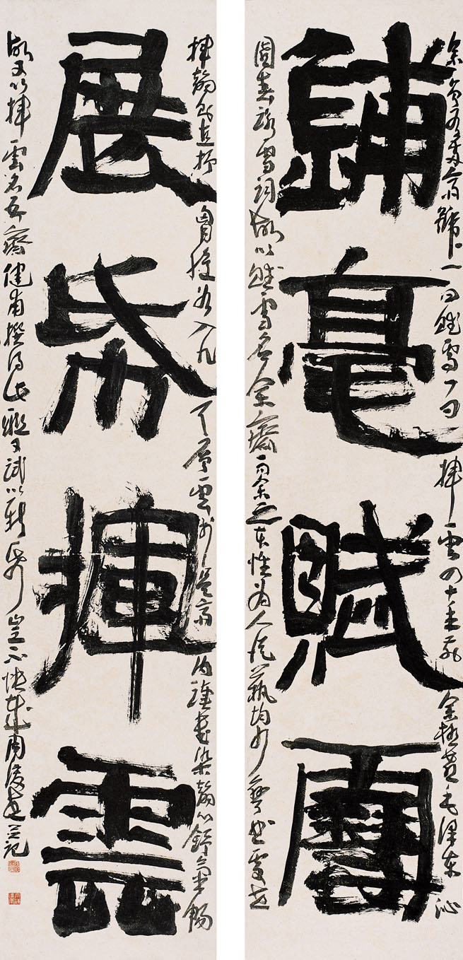 铺毫赋雪;展纸挥云。 余曾有两斋号,一曰“赋雪”,一曰“挥云”。四十年前,余颇喜毛泽东“沁园春.咏雪”词,故以“赋雪”名吾斋。而余非政治场中人,本性、为人、从艺均少弯曲;处世、挥翰则直抒胸臆,如入九天层云,故改斋名为“挥云”。吾之学棣健甫深知其意,故撰此联,颇合吾心,借汉人意书之。周俊杰并记。 233cm×53cm×2