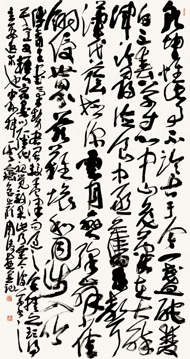 乾坤惟此事,不论古于今。 一盏酡双白,三春草寸心。 中山兔笔在,大醉浑沦寻。 俭食中丞旧,家声汉代荫。 杯深云月恋,綵舞雀翎侵。 世界兹难坏,和同涉入吟。 傅青主书气势宏阔,较孟津而过之。余橅之欲得其意,又杂以宿墨,以强化视觉效果,此乃余今后草书之主要追求也。中州挥云斋鲁岩周俊杰并记。 180cm×90cm (下为局部)