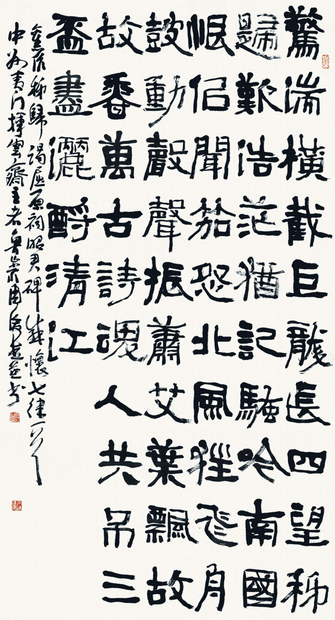 惊湍横截巨龙长,四望秭归叹浩茫。 犹记骚吟南国恨,似闻笳怨北风狂。 飞舟鼓动声声振,潇艾叶飘故故香。 万古诗魂人共吊,三杯尽洒酹清江。 旧作《秭旧谒屈原祠、昭君碑感怀》七律一首。中州夷门挥云斋主者鲁岩周俊杰并书。 180cm×90cm