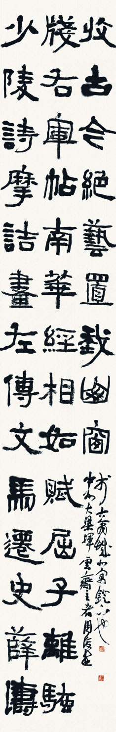 沧海日,赤城霞,峨眉雪,巫峡云,洞庭月,彭蠡烟,潇湘雨,武夷峰,庐山瀑布,合宇宙奇观,绘吾斋壁; 少陵诗,摩诘画,左传文,马迁史,薛涛笺,右军帖,南华经,相如赋,屈子离骚,收古今绝艺,置我山窗。 明陆湘客联。上联写景,下联论文,古今奇书,玉缀珠联,浑然一体,不着堆砌痕迹。中州大梁挥云斋主者周俊杰于古商城北寓灯下也。 366cm×60cm×2