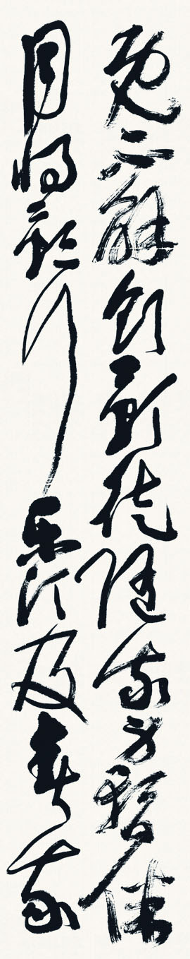 花间一壶酒,独酌无相亲。 举杯邀明月,对影成三人。 月既不解饮,影徒随我身。 暂伴月将影,行乐须及春。 我歌月徘徊,我舞影零乱。 醒时同交欢,醉后各分散。 永结无情游,相期邈云汉。 李白《月下独酌》诗。三人行者:诗人、明月、影子也。人对明月,月照孤影,何其怡然自得。周俊杰书。 180cm×36cm