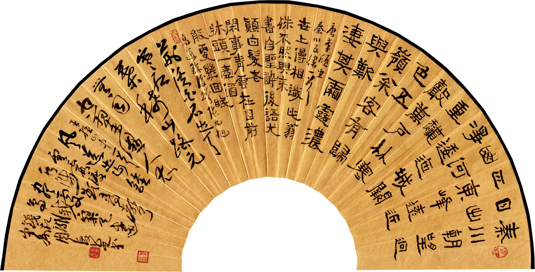 秦川朝望迥,日出正东峰。 远近山河净,逶迤城阙重。 秋声万户竹,寒色五岭松。 客有归与叹,凄其霜露浓。 唐李颀《望秦川》五律一首。 世上漫相识,此翁殊不然。 兴来书自圣,醉后语尤颠。 白发老闲事,青云在目前。 床头一壶酒,能更几回眠。 高适《醉后赠张九旭》。 荆溪白石出,天寒红叶稀。 山路元无雨,空翠湿人衣。 王维《山中》一首。 风送出山钟,云霞渡水浅。 欲寻声尽处,鸟灭寥天远。 钱起诗。 中州周俊杰书。 32cm×61cm