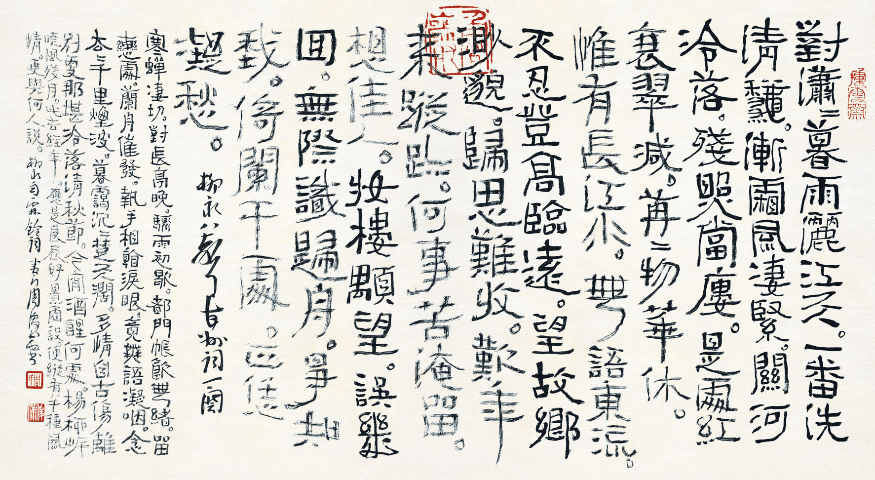 对潇潇暮雨洒江天,一番洗清秋。渐霜风凄紧,关河冷落,残照当楼。是处红衰翠减,苒苒物华休。惟有长江水,无语东流。不忍登高临远,望故乡渺邈,归思难收。叹来年踪迹,何事苦淹留?想佳人妆楼颙望,误几回,天(无)际识归舟。争知我,倚阑干处,正恁凝愁!