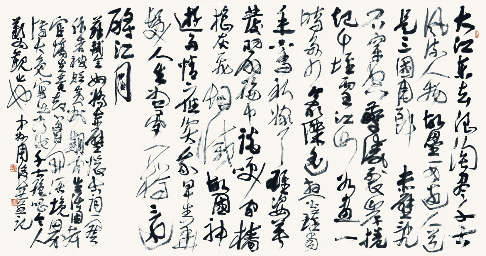 大江东去,浪淘尽,千古风流人物。 故垒西边,人道是,三国周郎赤壁。 乱石穿空,惊涛裂岸,卷起千堆雪。 江山如画,一时多少豪杰。 遥想公瑾当年,小乔初嫁了,雄姿英发。 羽扇纶巾, 谈笑间,樯橹灰飞烟灭。 故国神游,多情应笑我,早生华发。 人生如梦,一樽还酹江月。 苏轼《念奴桥?赤壁怀古》词一阕。作者被贬黄州期间,生活困顿,官场失意,却心胸开阔,境界博大,竟写出如此千古绝唱,令人叹为观止也。中州周俊杰并记。 98cm×182cm