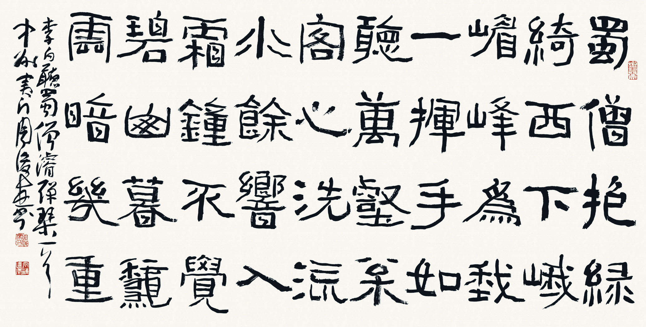 蜀僧抱绿绮, 西下峨嵋峰。 为我一挥手, 如听万壑松。 客心洗流水, 余响入霜钟。 不觉碧山暮,秋云暗几重。 李白《听蜀僧濬弹琴》一首。中州夷门周俊杰书。 66cm×135cm