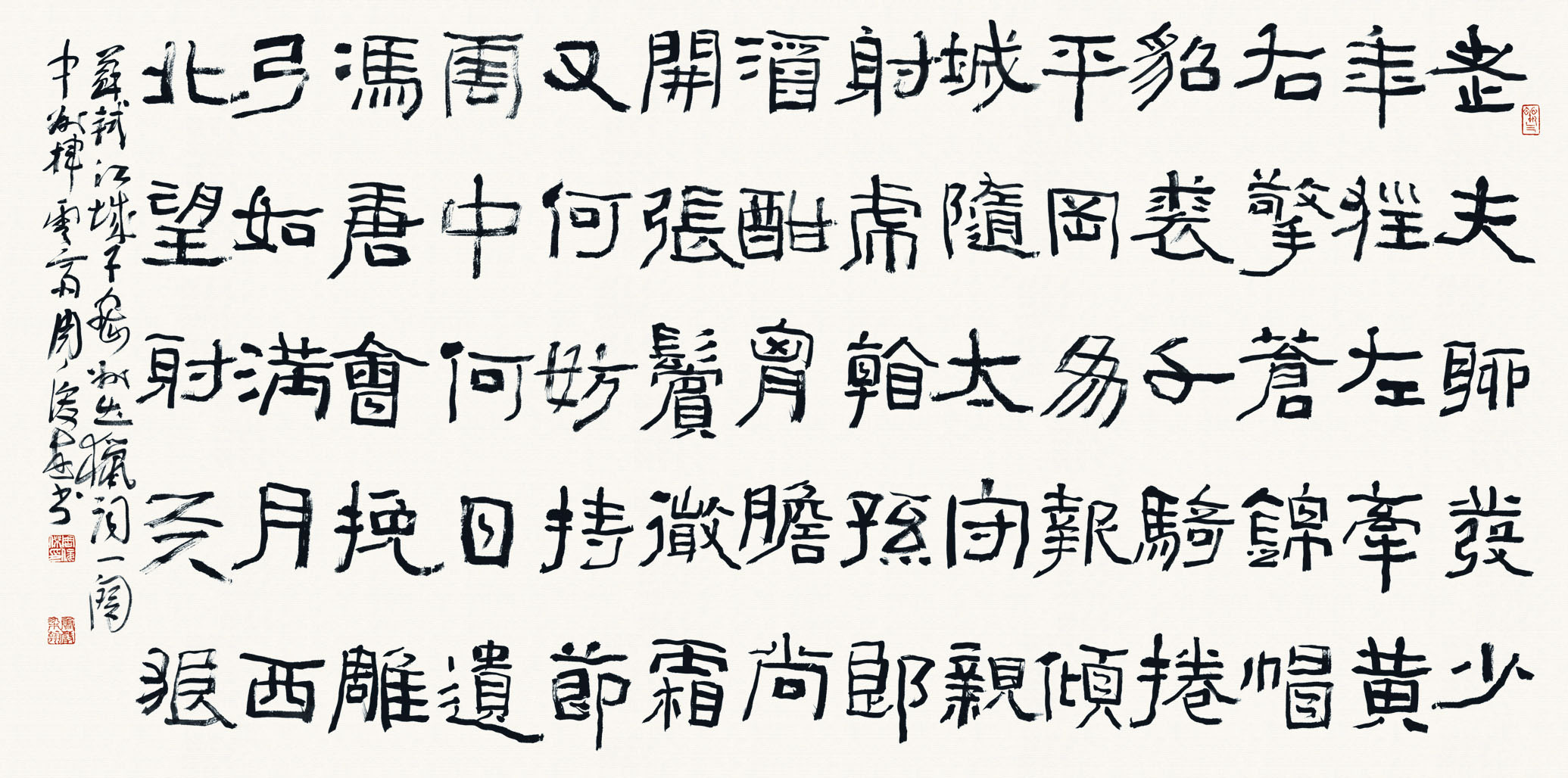 老夫聊发少年狂,左牵黄,右擎苍。锦帽貂裘,千骑卷平冈。为报倾城随太守,亲射虎,看孙郎。 酒酣胸胆尚开张,鬓微霜,又何妨!持节云中,何日遣冯唐?会挽雕弓如满月,西北望,射天狼。 苏轼《江城子.密州出猎》词一阕。中州挥云斋周俊杰书。 66cm×135cm