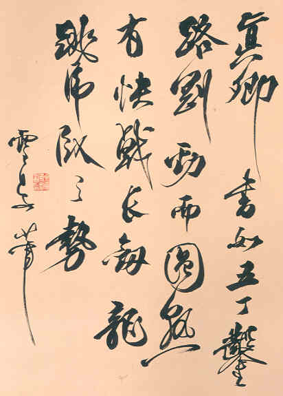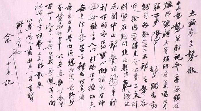 于书法一道,佘曼雪先生对历代名迹心摹手追,曾手写中国三千年百体书法,先后在香港、日本、美国展出,日本著名书家丰道春海谓之曰:“以一人之力,能写三千年百体书法,前所未有,不胜欣佩。”佘曼雪喜习瘦金书,其用笔多有创新,点如菊,撇捺如兰叶,横竖似竹干,瘦劲飘逸,虽字亦画,称新瘦全书。他爱作大字,多盈丈巨幅。有趣的是,他能双手做书画,香港电视台曾邀其作现场表演,即席双手齐挥,写出“龙飞凤舞”四个字,一反一正,观者无不称奇。先生之书得自古法,出于心意,勇于创新,数十年如一日。他有一方印章曰:《画学莲花书称莲体》,难怪其字成为莲裔。他对书法的观照是全方位的,20世纪70年代开始,从实用角度看,原子笔的使用越来越普遍化,他遂着力讲授原子笔的执笔、运笔及结构法,出版字帖多种,求其大众化。一面痴迷于学问的研究,一面不忘普及文化艺术教育,这就是佘雪曼的精神。