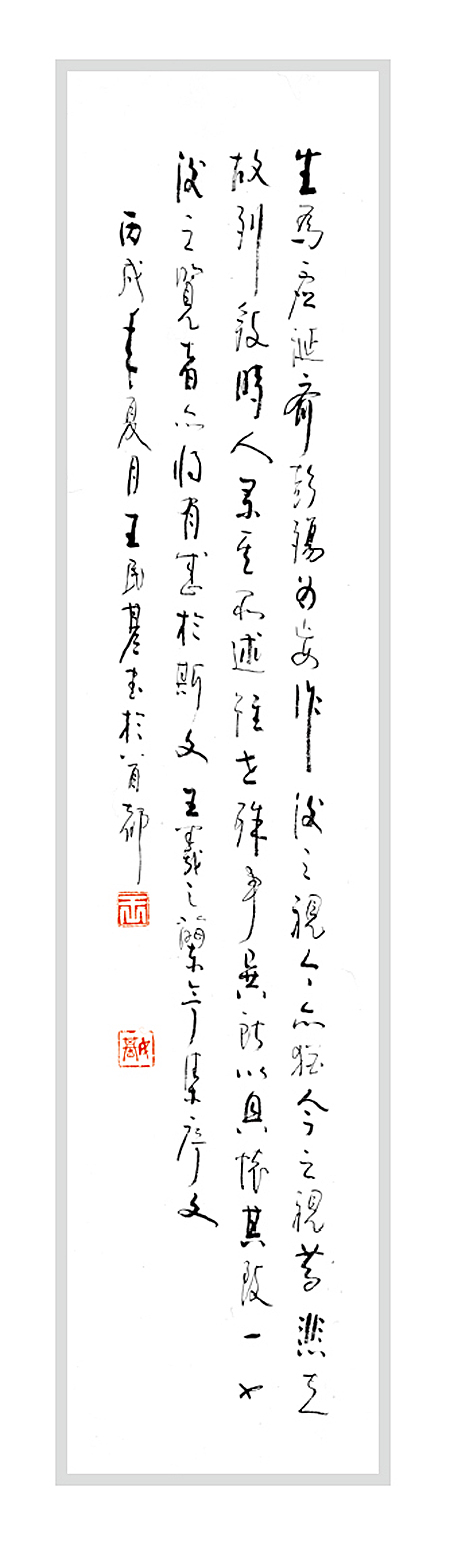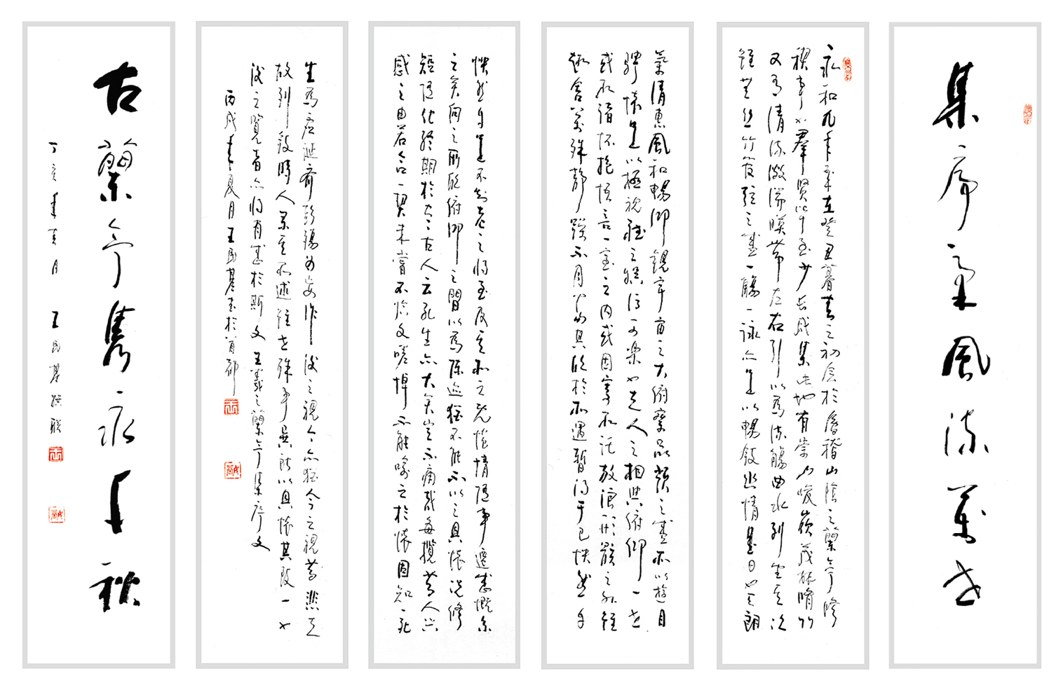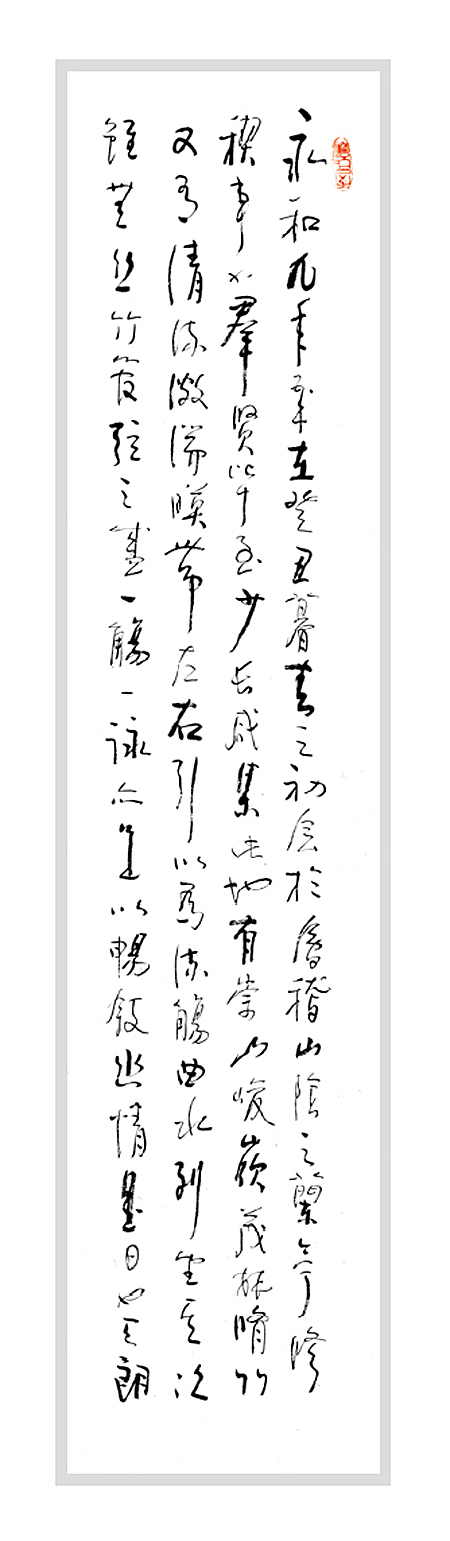 【释文】永和九年,岁在癸丑,暮春之初,会于会稽山阴之兰亭,修禊事也。群贤毕至,少长咸集。此地有崇山峻岭,茂林修竹;又有清流激湍,映带左右,引以为流觞曲水,列坐其次。虽无丝竹管弦之盛,一觞一咏,亦足以畅叙幽情。是日也,天朗气清,惠风和畅,仰观宇宙之大,俯察品类之盛,所以游目骋怀,足以极视听之娱,信可乐也。夫人之相与,俯仰一世,或取诸怀抱,晤言一室之内;或因寄所托,放浪形骸之外。虽取舍万殊,静躁不同,当其欣于所遇,暂得于己,快然自足,不知老之将至。及其所之既倦,情随事迁,感慨系之矣。向之所欣,俯仰之间,已为陈迹,犹不能不以之兴怀。况修短随化,终期于尽。古人云:“死生亦大矣。”岂不痛哉!每览昔人兴感之由,若合一契,未尝不临文嗟悼,不能喻之于怀。固知一死生为虚诞,齐彭殇为妄作。后之视今,亦犹今之视昔。悲夫!故列叙时人,录其所述,虽世殊事异,所以兴怀,其致一也。后之览者,亦将有感于斯文。