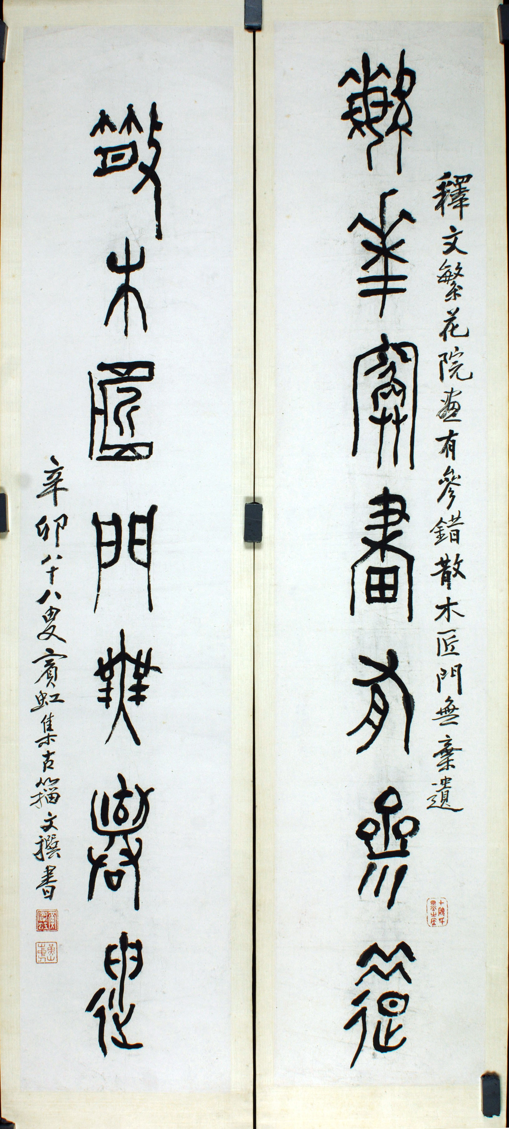 释文:繁花院画有参错,散木匠门无弃遗。 款识:辛卯八十八叟宾虹集古籀文撰书。 钤印:十砚千墨之居(朱文印)、黄宾虹(白文)、黄山山中人(朱文)