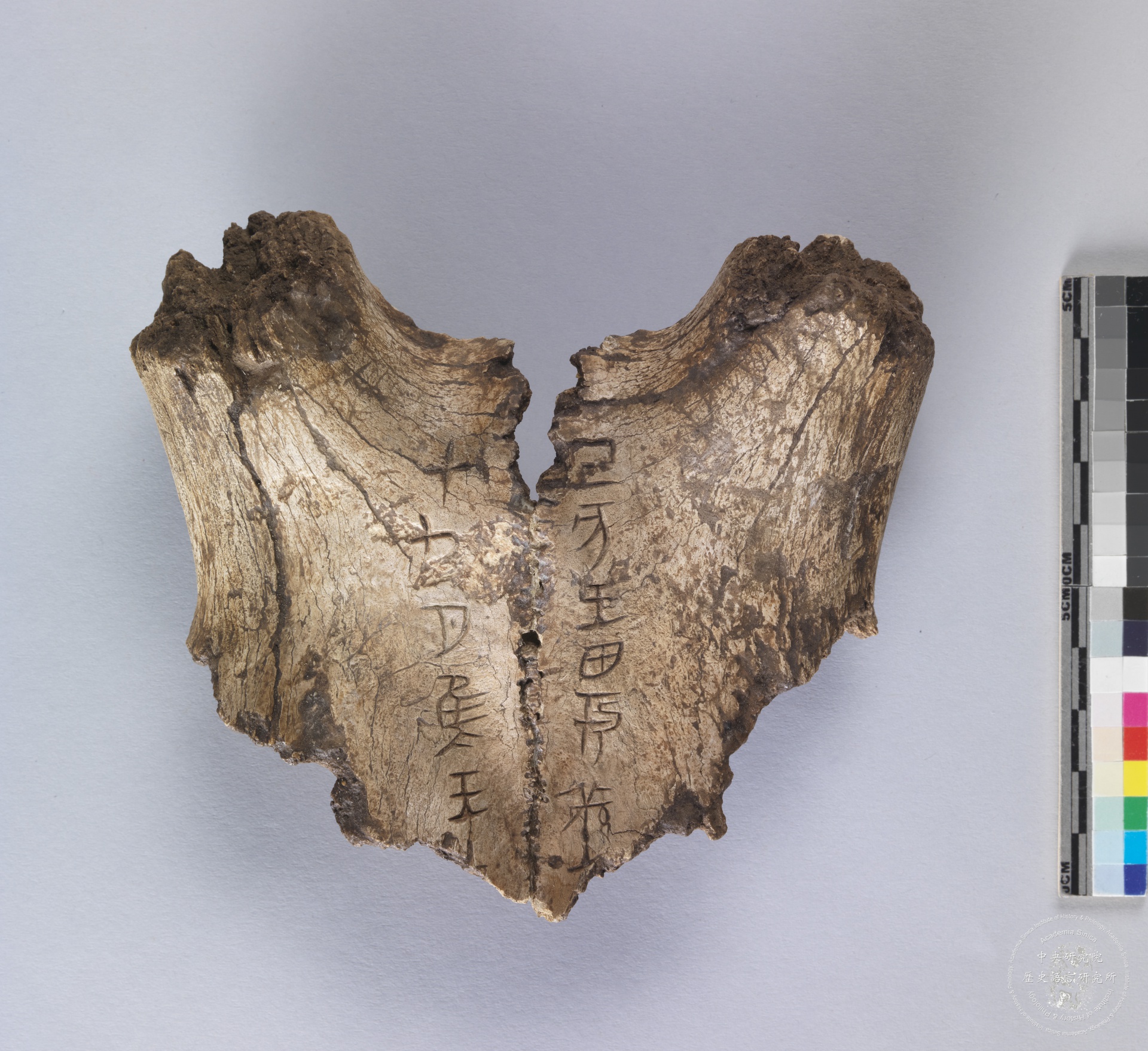 于民国时期史语所第三次殷墟挖掘出土,董作宾先生认为时代是在殷王帝辛十年;与《甲》3940为目前出土唯二带刻辞鹿头骨。 释文:己亥王田于羌…… 典藏号:R041039 年代:商代晚期 尺寸:长10.5×宽12.5cm 出土地:河南省安阳县小屯 材质:鹿头骨