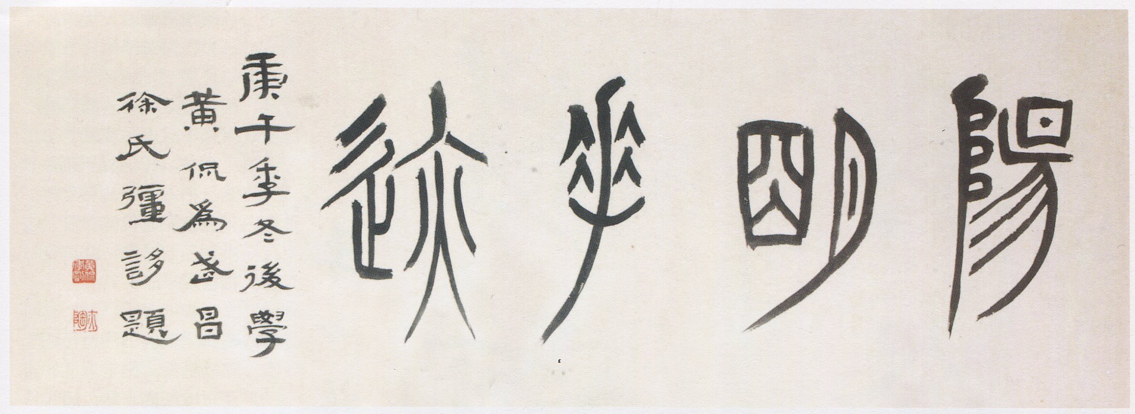 黄侃《篆书阳明手迹横披》37×130cm 1930年作 湖北省博物馆藏 释文:阳明手迹。 款署:庚午季冬后学黄侃为武昌徐氏彊誃题。 钤印:黄侃季刚(白文)、亦陶(朱文) 【资料来源】《书画艺术》杂志2013年第一期