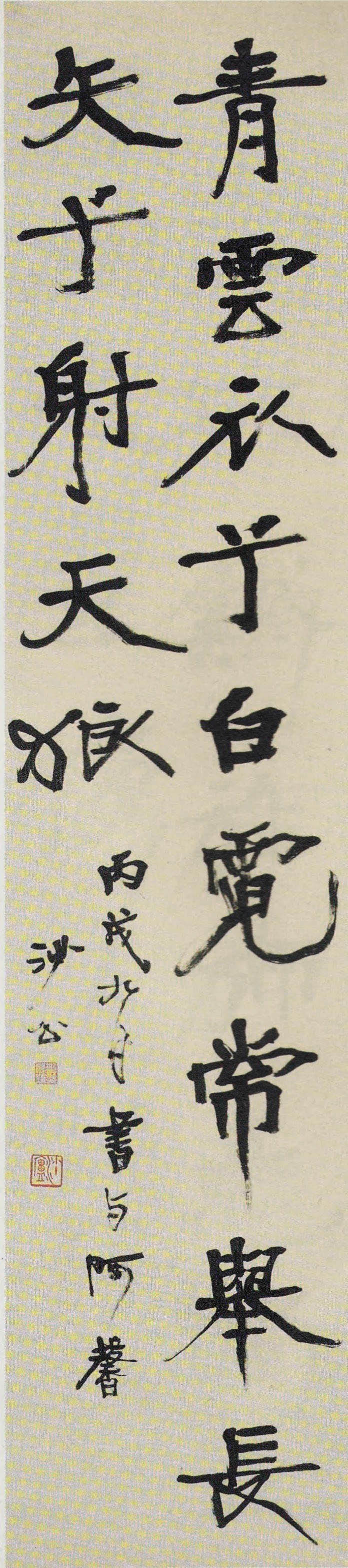 释文:青云衣兮白霓裳,举长矢兮射天狼。 款识:丙戌九月书与阿馨,沙公 钤印:沙庐(朱文)、胡光炜印(白文)