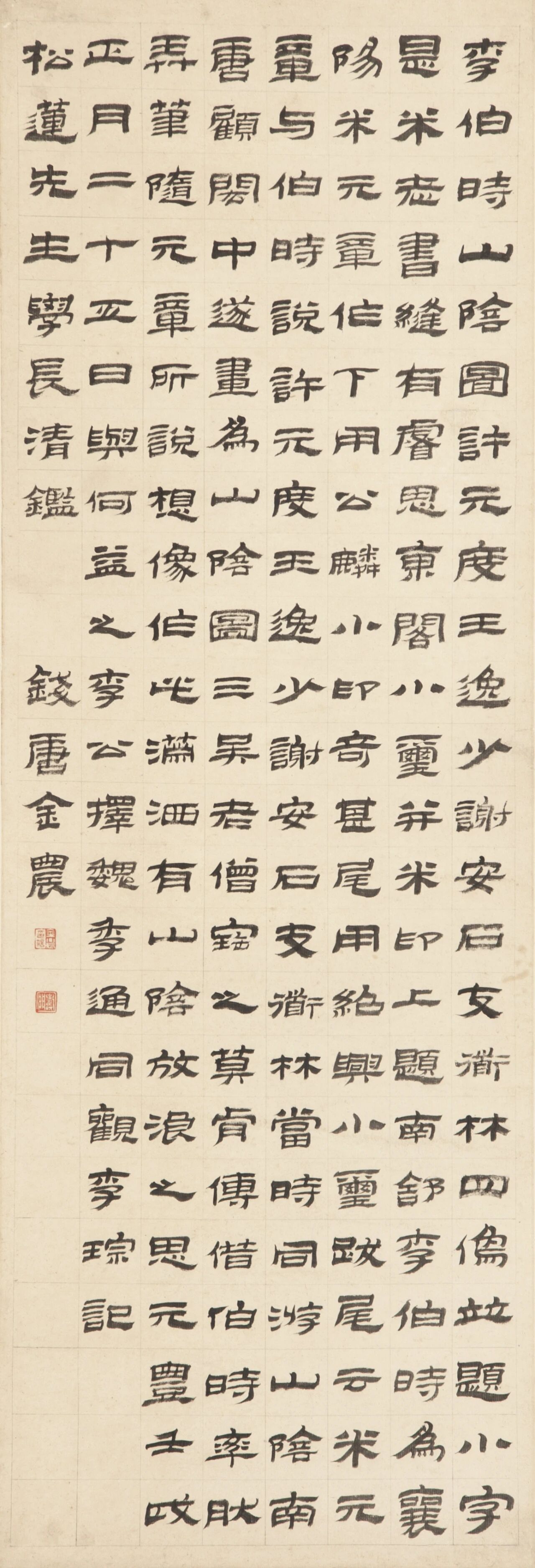 金农《隶书节录宋代李琮题跋李公麟山阴图轴》126.5cm×42.4cm 浙江省博物馆藏