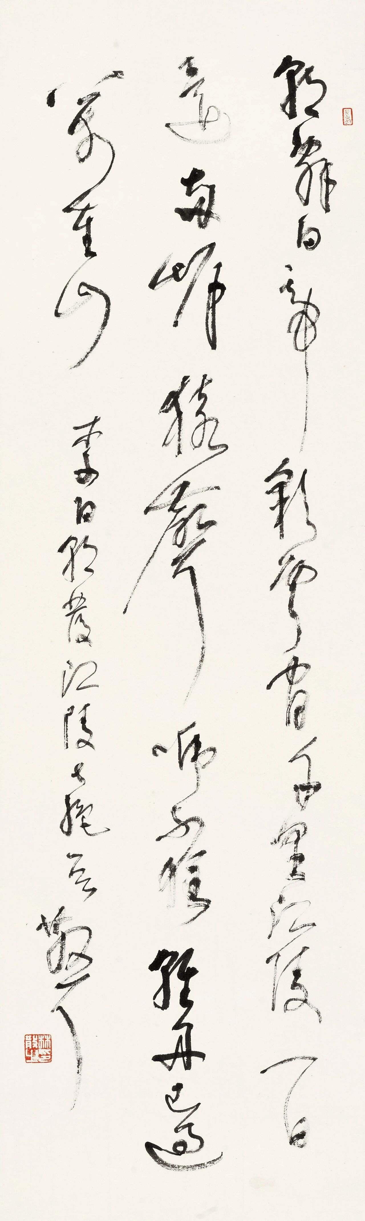 林散之《草书李白早发白帝城诗轴》 107×32cm 70年代 宋玉麟食砚斋藏 释文:朝辞白帝彩云间,千里江陵一日还。两岸猿声啼不住,轻舟已过万重山。 款署:李白朝发江陵七绝一首,散耳。 钤印:长寿(朱文)、林散之印(白文)