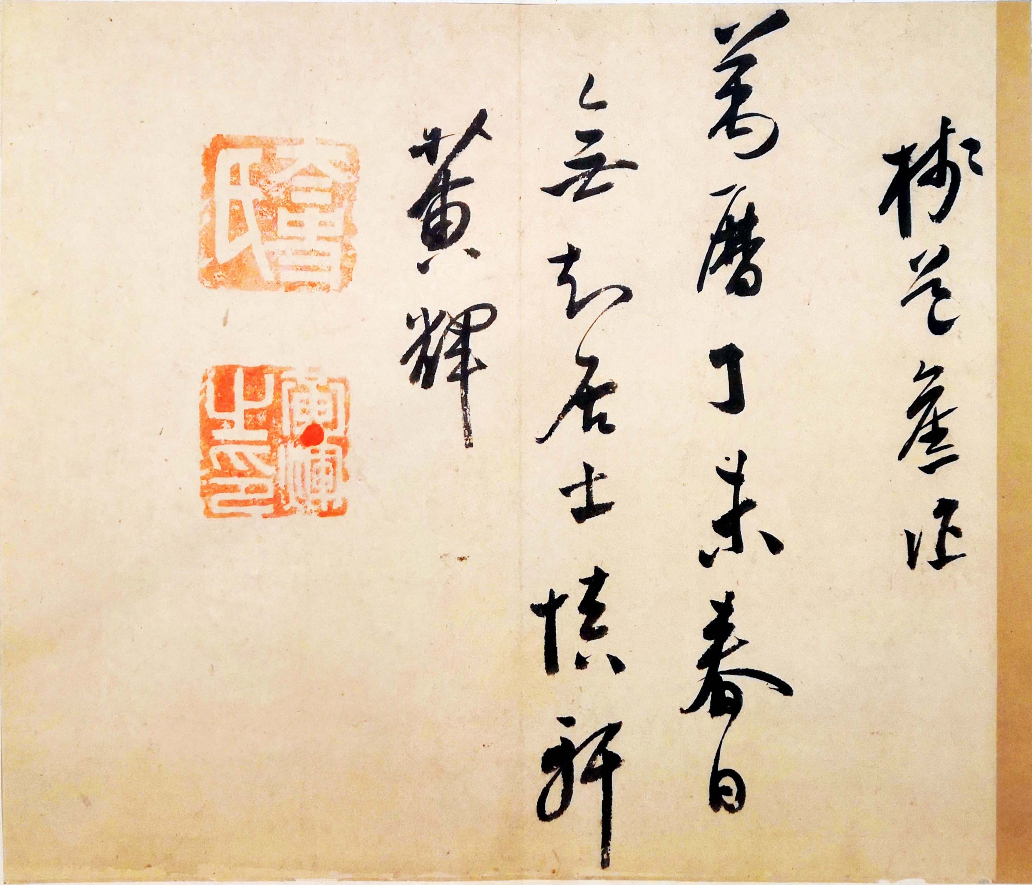 黄辉《行书自作诗七首册页》共12页。每页6行,每行4至6字不等,除了第一页第二行的一个“园”字已剥蚀外,其余近300字都完整无损。该册书作者自作五言律诗7首,其中5首咏山水,1首赠别,1首抒怀。该册书写于万历丁未(1607),黄辉时年48岁,正当中年。用笔俊迈,布局疏朗,行气脱略,韵致潇洒,墨法圆润,风格逼似米芾。书与诗珠联璧合,相得益彰,达到了炉火纯青、出神入化的境地。书册后有当代书法家、诗人吴丈蜀题诗及胡厥文、胡子昂跋语。吴丈蜀诗云:“三百余年劫后存,世传孤本更堪珍。从今诗苑书坛史,记下东坡第二人”。胡厥文跋:“明太史黄辉的墨宝,诗既清新,字尤瑰丽,至宝也”。胡子昂跋:“明太史黄辉的诗和书法堪称珍品”。黄辉书法传世甚少,似此精品,国内罕见。