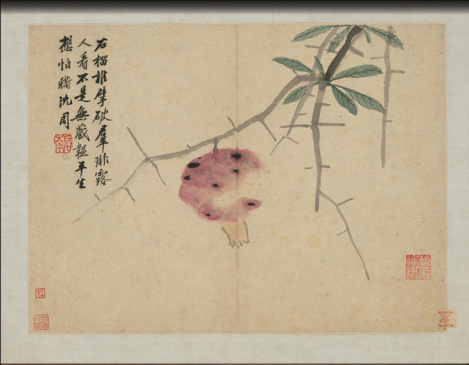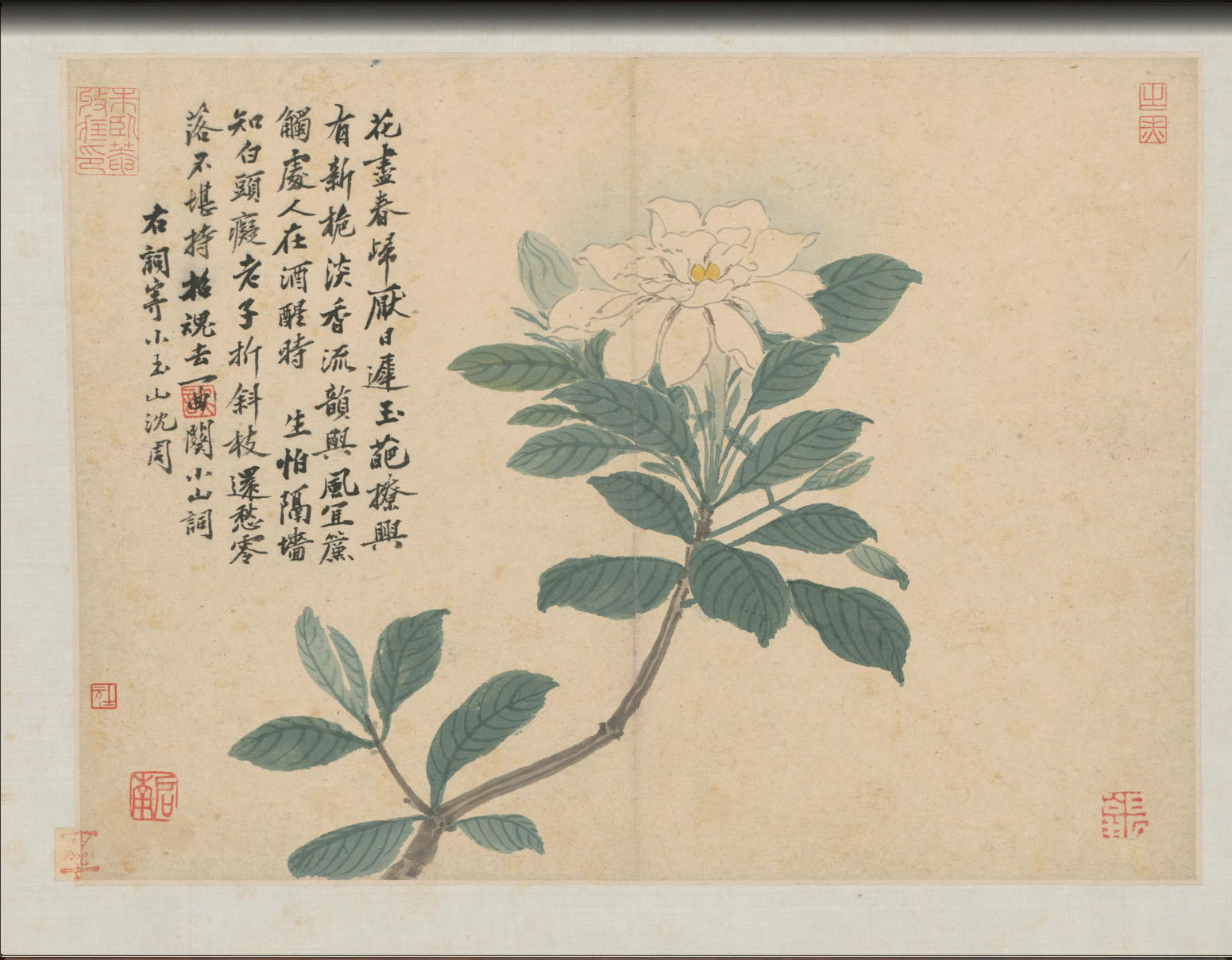 首开自书“卧游”两字,楷法劲健,钤朱文“沈氏启南”印,其后分别绘石榴、平坡散牧、栀子花、山水小景、秋山读书、枇杷、雏鸡、芙蓉、仿倪山水、梅花、杏花、秋柳鸣蝉、江山坐话、白菜、江山垂钓、仿米山水、雪江渔夫等山水、花鸟小景。每幅均有作者题诗或词,结合画面物象抒发其内心感受。落款后钤朱文“启南”、白文“石田”或白文“石田翁” 等印。