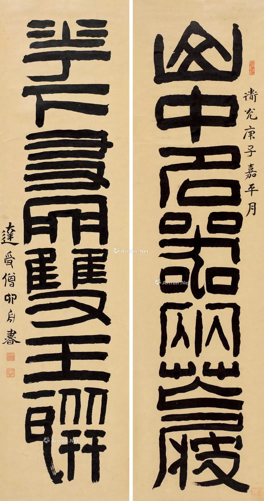 达受《篆书“山中花下”七言联》纸本篆书 110.3×28.5cm×2 1840年作 香港邦瀚斯2025拍卖