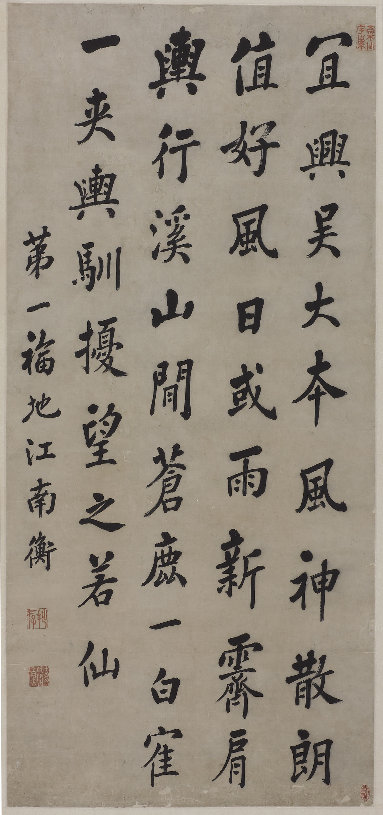 蒋衡《行书节录罗玘西溪渔乐说轴》 132×60.5cm 无锡博物院藏 释文:宜兴吴大本风神散朗,值好风日,或雨新霁,肩舆行溪山间,苍鹿一、白鹤一,夹舆驯扰,望之若仙。 款识:第一福地江南衡。 钤印:拙存(朱文)、蒋衡(白文)、橐宇巢仙(朱) 【资料来源】无锡博物院