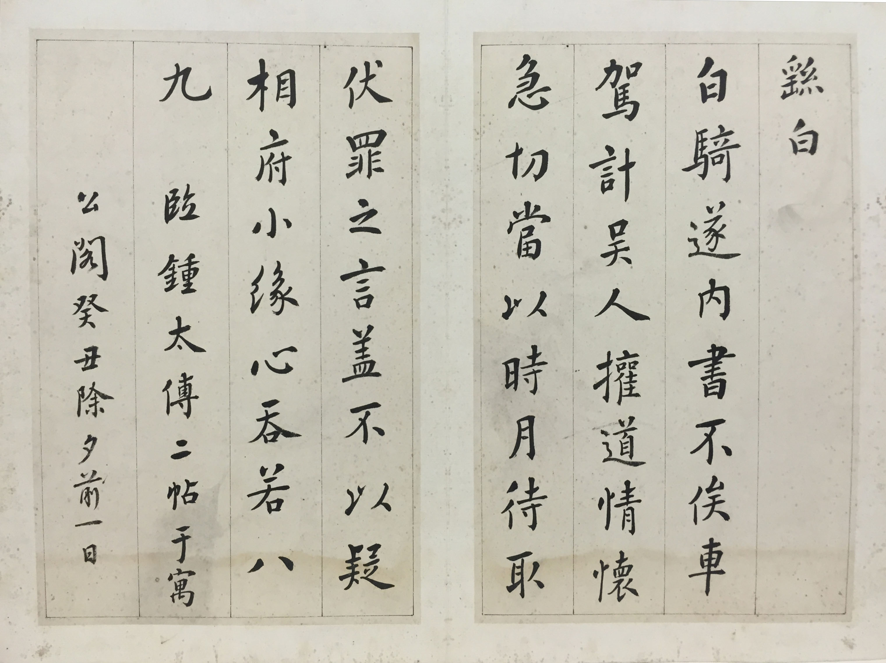 款识:右共十八幅,临十二家书。因金生弼成酷嗜余书,所得已夥,举其未揣摩者示之,而《淳化阁帖》中文辞多脱略,且多忧虞疾痛语,不可用之酬应,此册取其明顺者,俾熟习适用,亦老夫苦心也。癸丑除夕迎春后,江南拙老人蒋衡记。