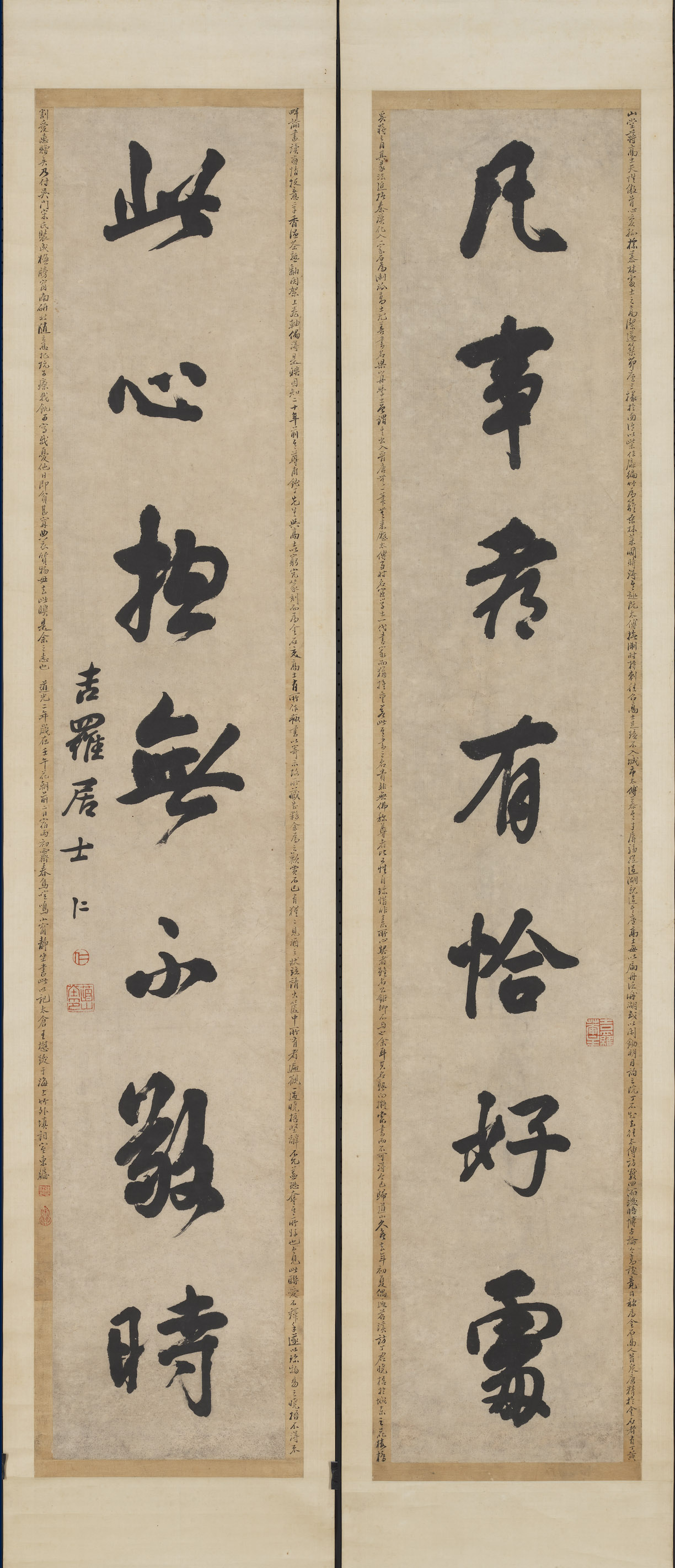 边幅题跋:山堂蒋高士天性傲骨。心爱孤标。慕林处士之高洁。遂筑茆庐三椽于西泠。以柴作扉。徧竹为篱。桑林菜圃。时得其趣。阮太傅抚淛时。持刺往召高士。足蹟不入城市。太傅慕其才。屏騶从过湖。亲造其庐。高士每以扁舟泛洀(点去)湖。或以闲锄明月询之院丁。不知去往。太傅访数四而后晤。博古论今。高谈竟日。称为金石高人。昔泉唐精于金石者。有丁黄奚蒋之目。其篆法追抚秦汉。化入一家。名为淛派。高士尤善书名。梁小丹学士曾谓其出入晋唐。无一笔无来歷。太傅当时名宦学士。一代书家。而犹推重若此。其书之名贵。非无佛称尊者比。可性自珍惜。非素所心契者。虽名公鉅卿不与也。余耳其名熟。向拟索书而不可得。今已归道山久矣。去年初夏偶过苕溪。访丁君晓梧于城东之花楼桥畔。论书读画。情投意孚。香温茶熟。翻阅架上卷轴。偶得是联。固知二十年前。其尊甫钝丁先生与高士以穷究篆刻。而为金石交。高士有所作輒书以寄示。故所藏甚伙。余为之叹。赏石已有猩猩见酒之状。竝请出篋中所有者。遍观一过。晓梧坚辞不允。盖恐夺其所好也。今见此联爱不释手。遂以珍物易之。晓梧不得不割爱惠赠矣。乃付吴门宋氏装成楹牓。窗南研北。随意把玩。可疗我飢。可写我忧。他日即贫甚。宁典衣质物。毋去此联。是余之志也。道光二年岁在壬午花朝前二日。宿雨初霽。春鸟喧鸣。小窗静坐书此以记。太仓王懋跋于海上竹外填词室东牖。