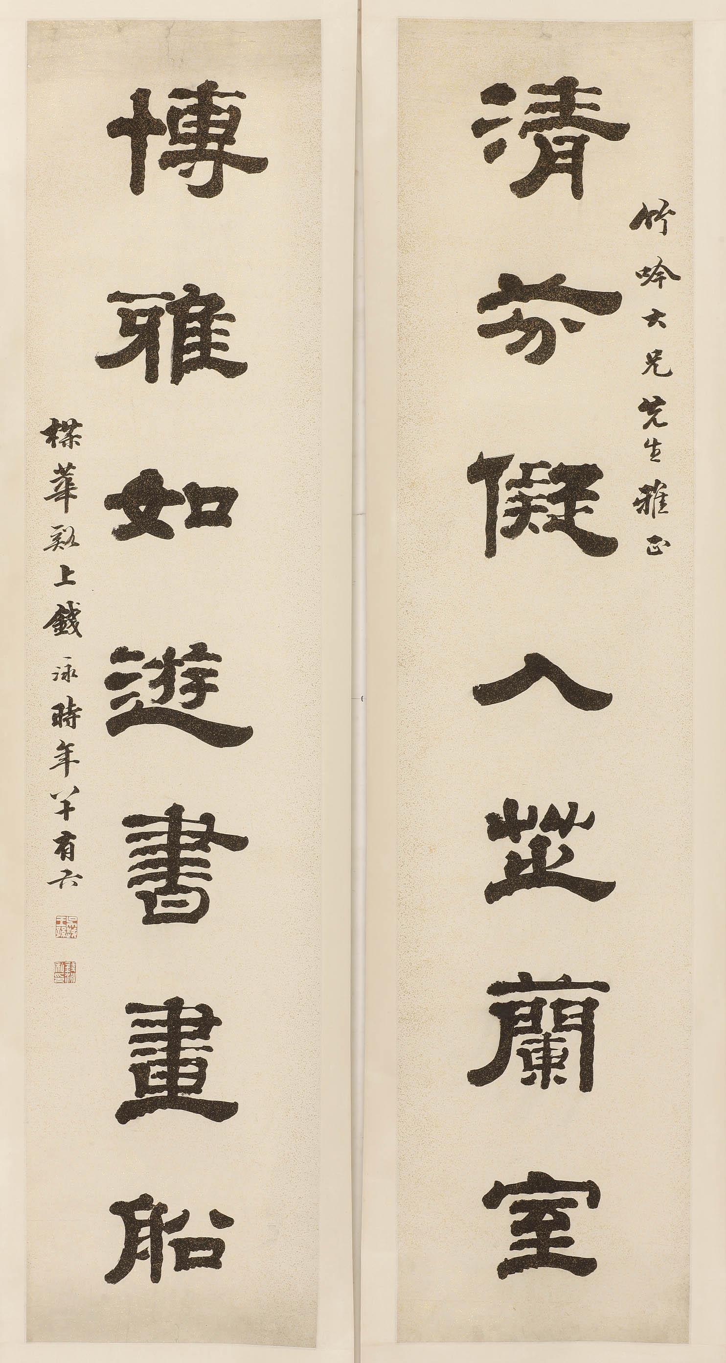 钱泳 《隶书“清芬博雅”七言联》 134×30cm×2 无锡博物院藏 释文:清芬疑入芷兰室,博雅如游书画船 款识:竹吟大兄先生雅正,梅花溪上钱泳,时年八十有六。 钤印:吴越王孙(白) 钱泳私印(白) 【资料来源】无锡博物院网站