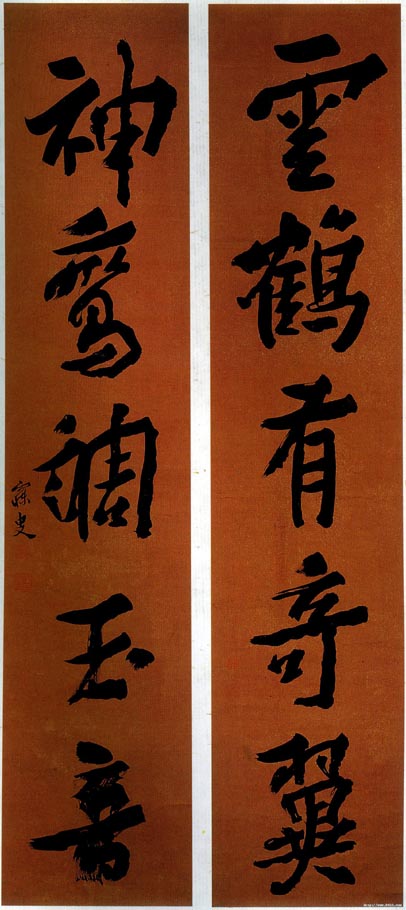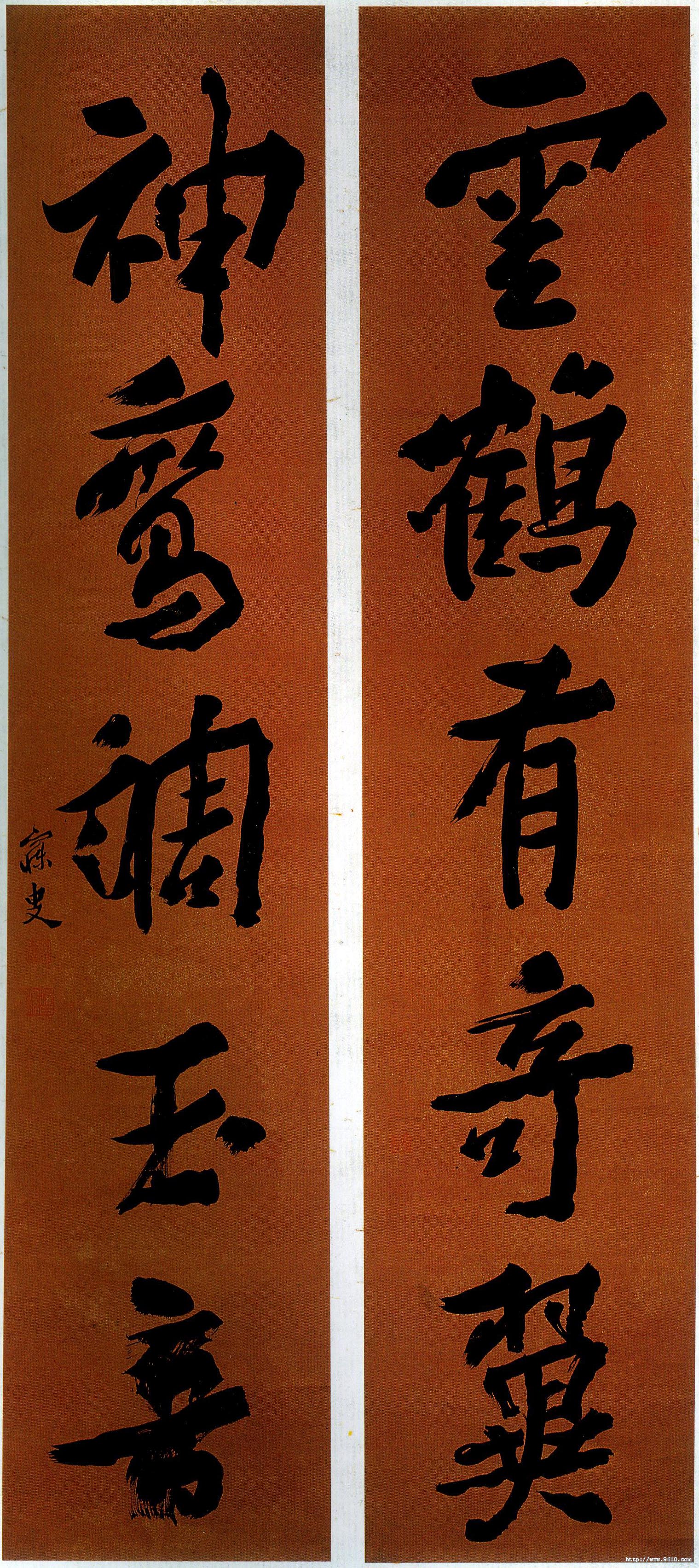 沈曾植《行书雲鹤神鸾五言联》冷金笺本 169×36.5cm×2 上海信仁第二届艺拍 释文:雲鹤有奇翼,神鸾调玉音。 款署:寐叟 钤印:延恩世泽(朱)、知一念即无量劫(朱)、曾植印信(朱)、海日楼(白) 上海信仁拍卖有限公司第二届大型艺术品拍卖会1452 拍卖时间:2004-04-17 估价:RMB 12,000--16,000 成交价 :35,200 【资料来源】来自《书法》杂志2006年第9期 声明:资料仅供学习参考,本站并不能保证作品的真实性。