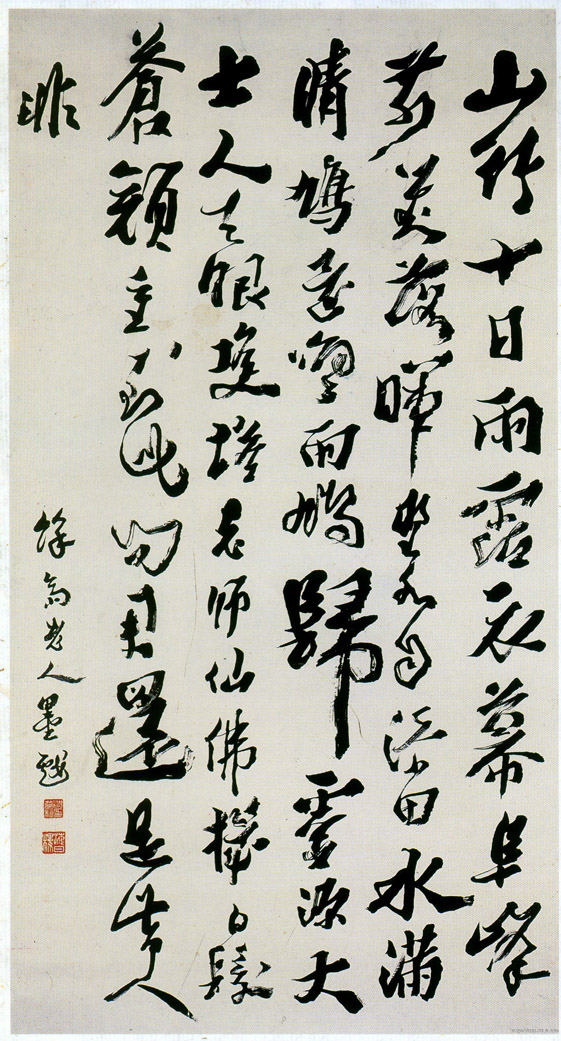 沈曾植《行草黄庭坚七律诗轴》纸本行书 144×74.5cm 嘉兴博物馆藏 释文:山行十日雨沾衣,幕阜峰前对落晖。野水自添田水满,晴鸠还唤雨鸠归。 灵源大士人天眼,双塔老师诸佛机。白发苍颜重到此,问君还是昔人非。 款署:馀斋老人墨戏。 钤印:沈曾植印(白文)、海日楼(白文) 【资料来源】来自《书法》杂志2006年第9期 《海日流光》(中华书局)