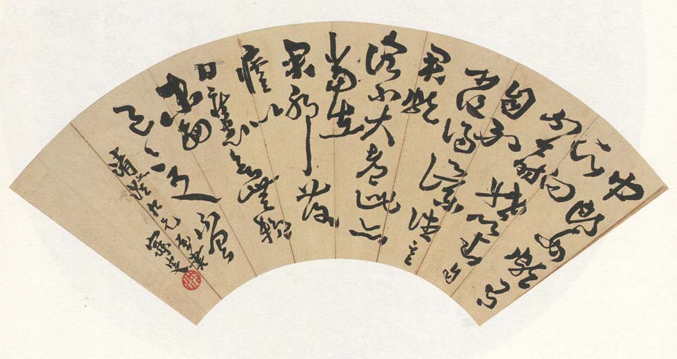 沈曾植《草书王羲之帖扇面》纸本 17×47.5cm 桐乡君匋艺术院藏 释文:中郎女颇有所向不?今时婚对,自自不可复得。仆往意,君颇论不?大都此亦当在君耶!发疟,比日疾患,欲无赖。未面,邑邑!反不具。 款署:清澄仁兄属书,寐叟。 钤印:沈(朱文) 【资料来源】《海日流光》(中华书局)