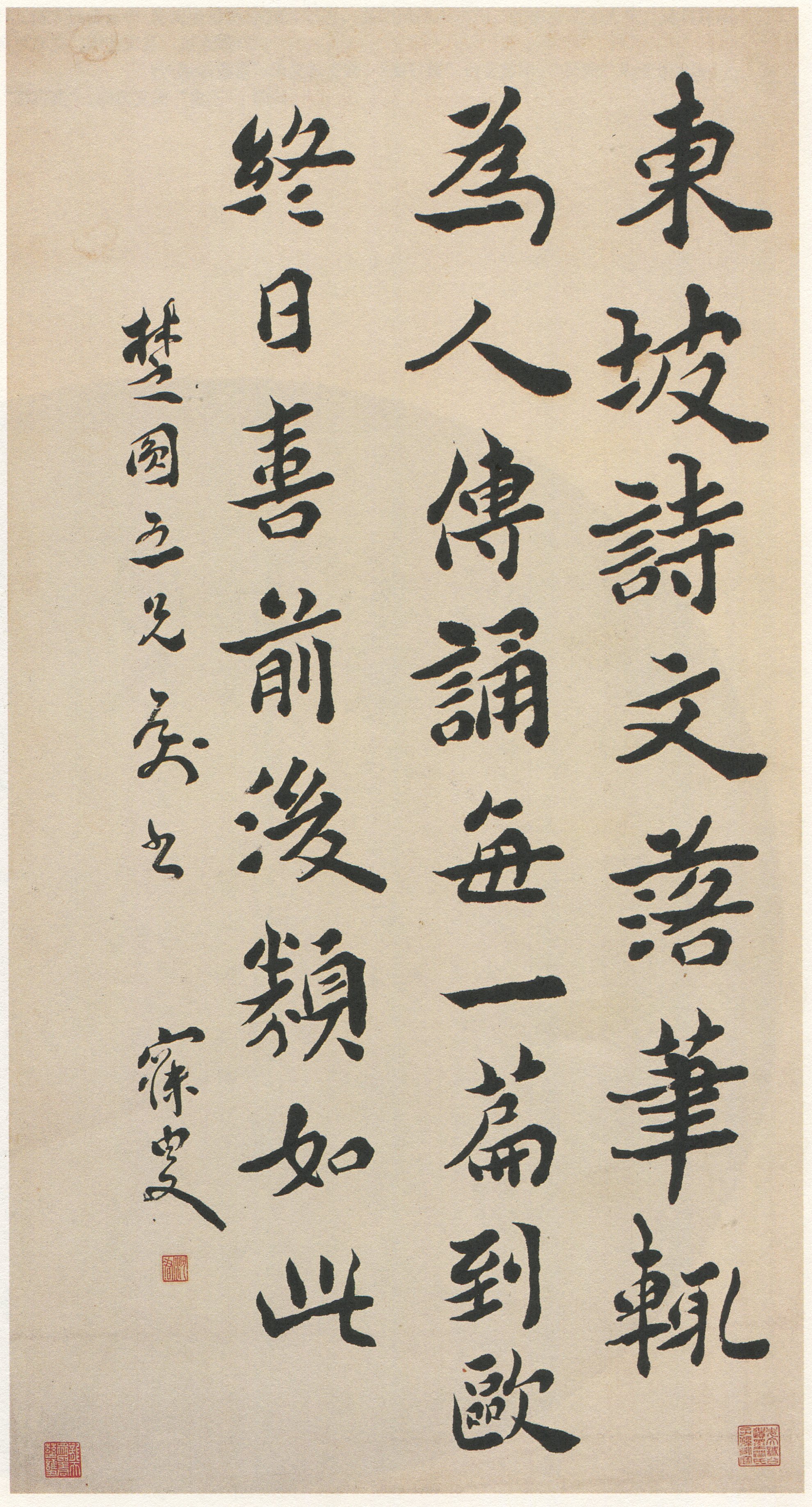 沈曾植《楷书东坡诗文轴》纸本楷书 88.2×46cm 浙江省博物馆藏 释文:东坡诗文,落笔辄为人传诵,每一篇到,欧终日喜,前后类如此。 款署:楚圆五兄属书,寐叟。 钤印:沈君(朱文) 【资料来源】《海日流光》(中华书局)