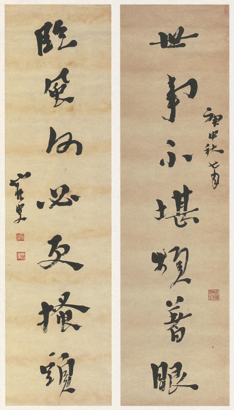 沈曾植《世事临风七言联》纸本行书 119.3×31.2cm×2 天一阁博物馆藏 释文:世事不堪频着眼,临风何必更搔头。 款署:庚申秋七月,寐叟。 钤印:寐叟(白文)、海日楼(白文)、象莲花未开形(朱文) 【资料来源】《海日流光》(中华书局)