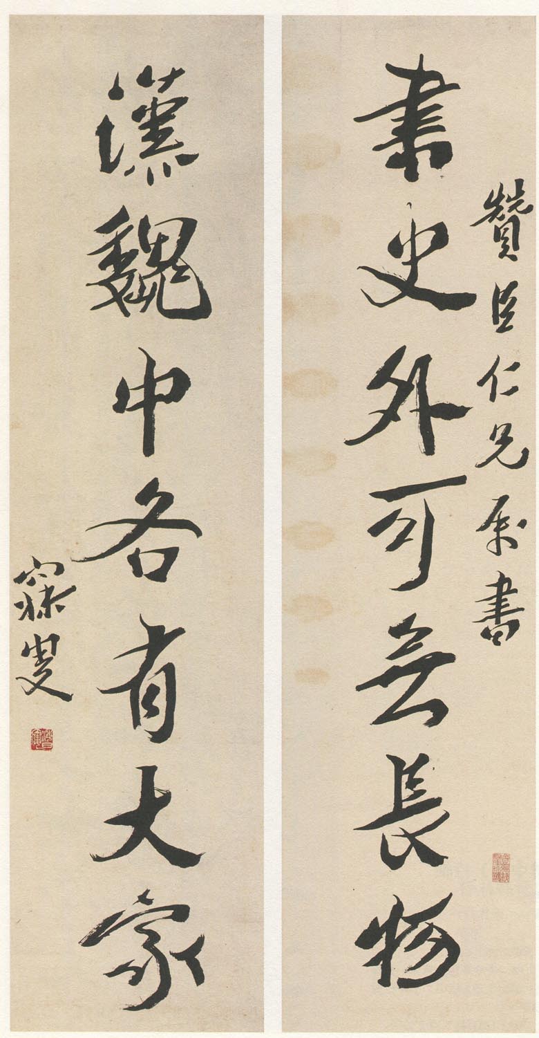 沈曾植《书史汉魏七言联》纸本行书 133×33cm×2 桐乡君匋艺术院藏 释文:书史外无长物,汉魏中各有大家。 款署:赞臣仁兄属书,寐叟。 钤印:海日楼(白文) 【资料来源】《海日流光》(中华书局)