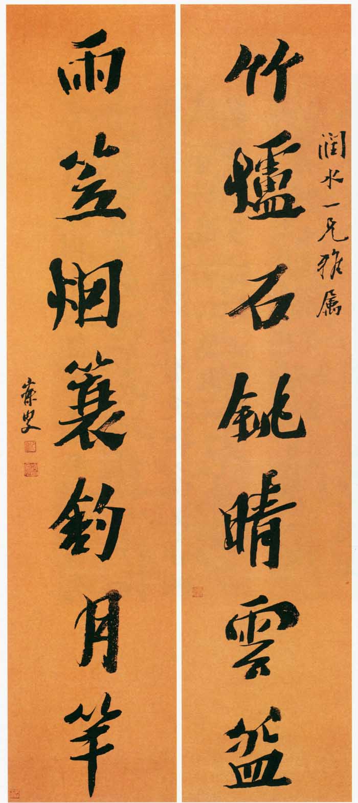 沈曾植《行书竹炉雨笠七言联》纸本行书 163×34.5cm×2 苏伟网藏 释文:竹炉石铫晴雲碗,雨笠烟蓑钓月竿。 款署:润水一兄雅属,寐叟。 钤印:乙盦(朱文)、海日楼(白文) 【资料来源】《海派书家系列-沈曾植卷》(上海书画出版社 可嘉提供)