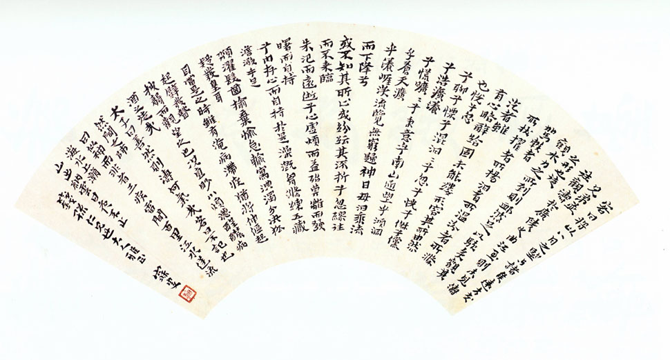 沈曾植《枚乘七发扇面》纸本楷书 26×55cm 嘉兴博物馆藏 释文:略。 款署:篯孙仁兄世大人雅正。寐叟。 钤印:植(朱文) 【资料来源】《海派书家系列-沈曾植卷》(上海书画出版社 可嘉提供)