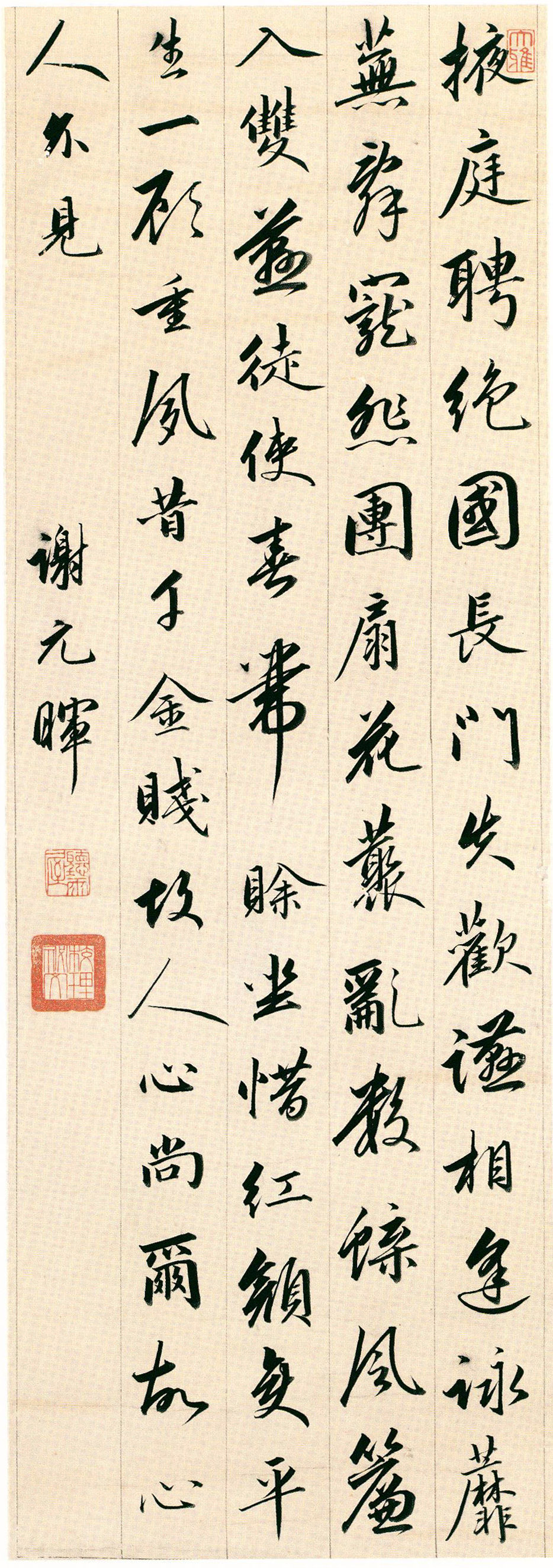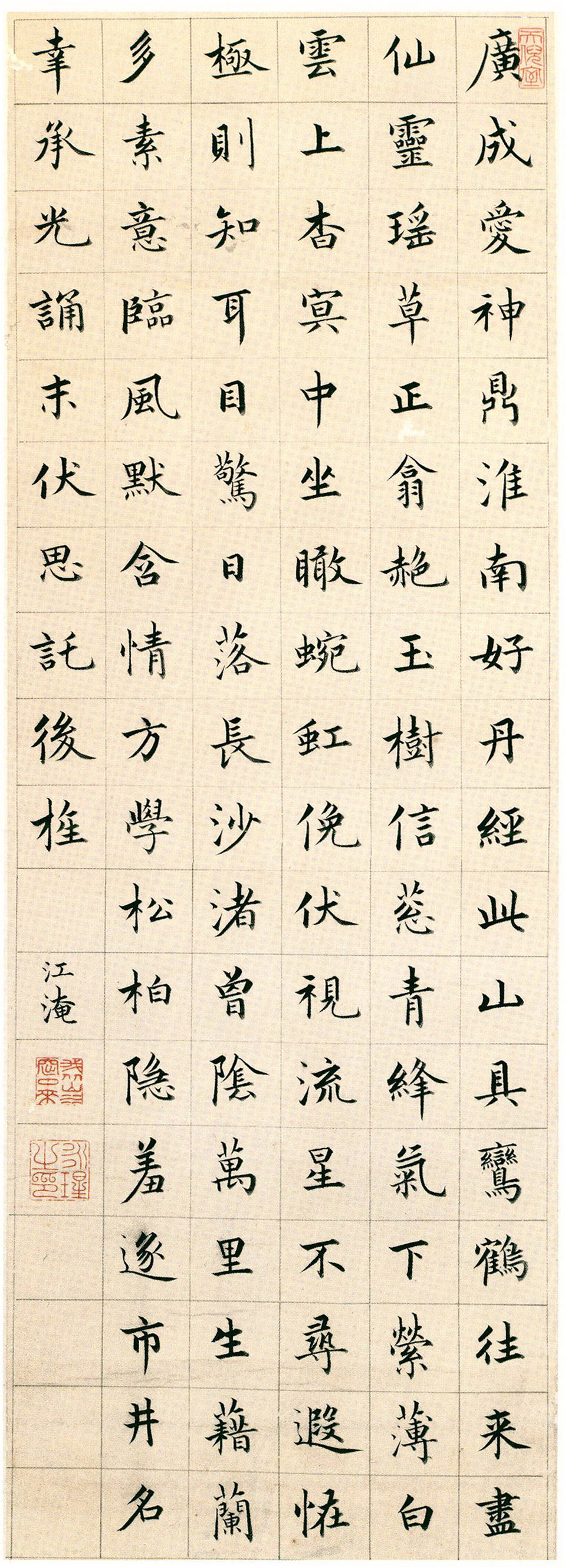 四条屏以真、行二体书录谢朓、江淹、王安石、李卫公等四家诗文。分别钤“听雨屋” (朱文) 、“校理秘文” (朱文) 、“大雅”(朱文) 、“我从山水窋中来” (朱文) 、“永瑆之印”(朱文)、“而倪室”(朱文) 、“看雪阁”(白文)、“有文”(朱文,葫芦) 、“成亲王”(白文) 、“唯壬申吾以降”(朱文)印。